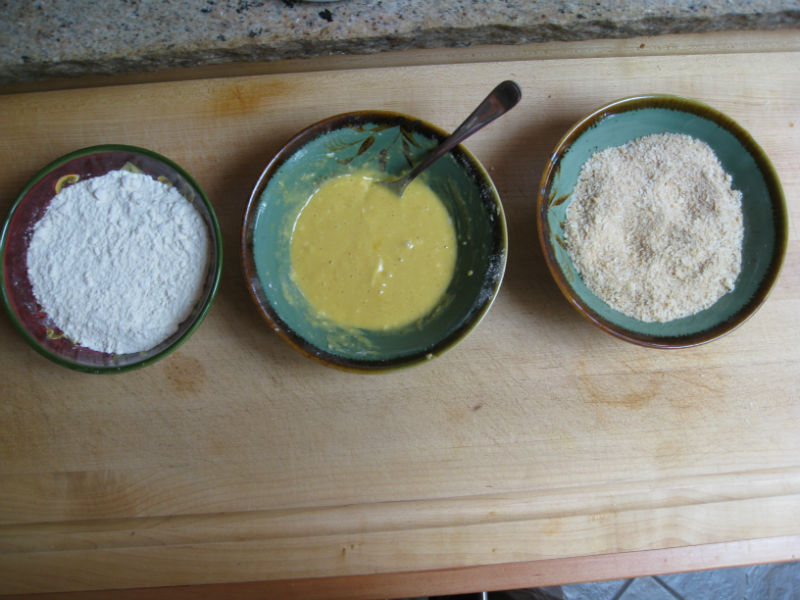 Flour; egg and mustard with a little flour; breadcrumbs and cheese