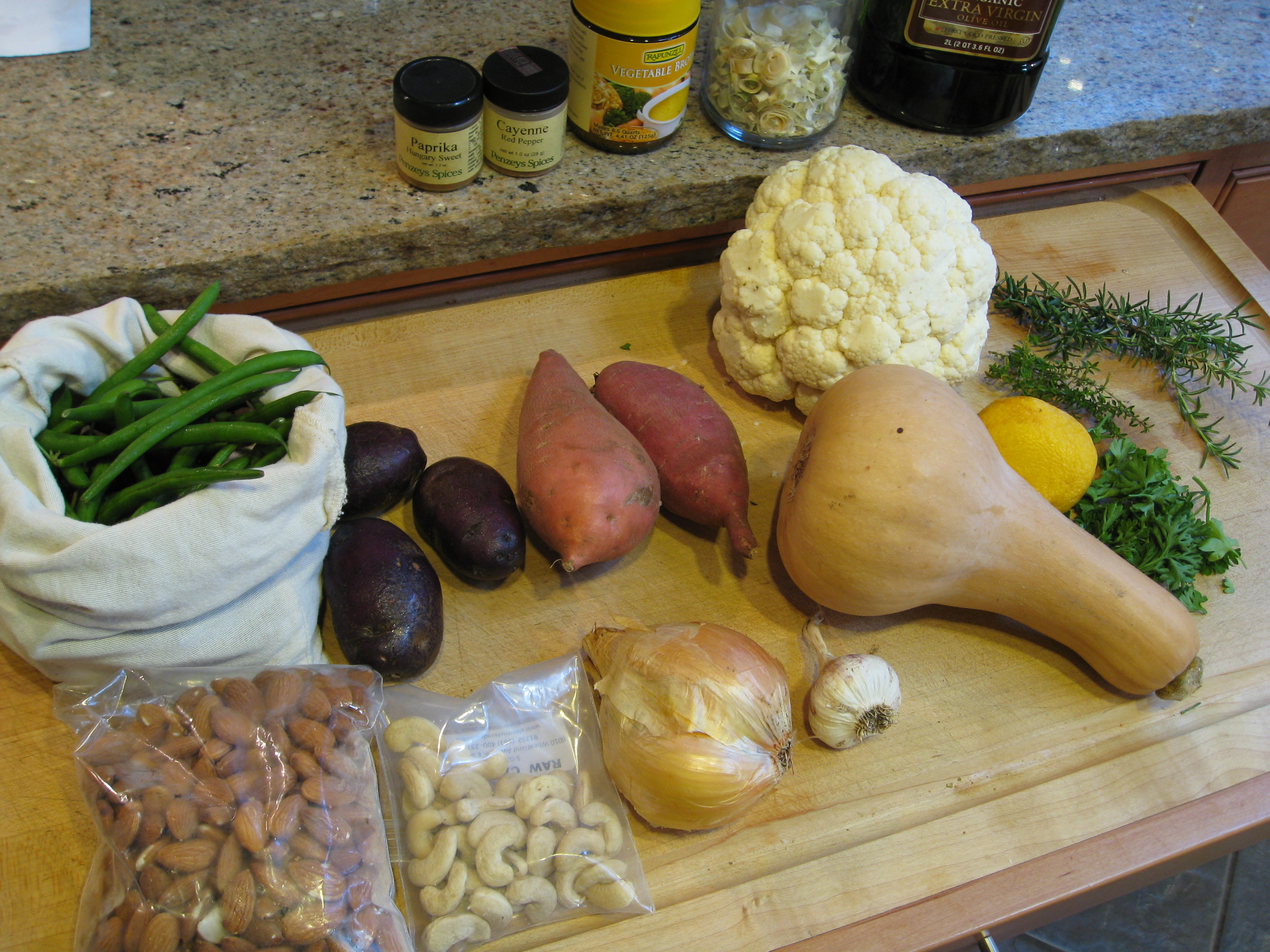 It’s new recipe time! This one uses foods from the summer harvest (mostly) and makes enough for leftovers. Mixing flavors of sweet potatoes, butternut squash and green beans also makes this dish colorful, and the delicious, savory sauce made from…cauliflower (don’t be afraid) put smiles on everyone’s face at the table.