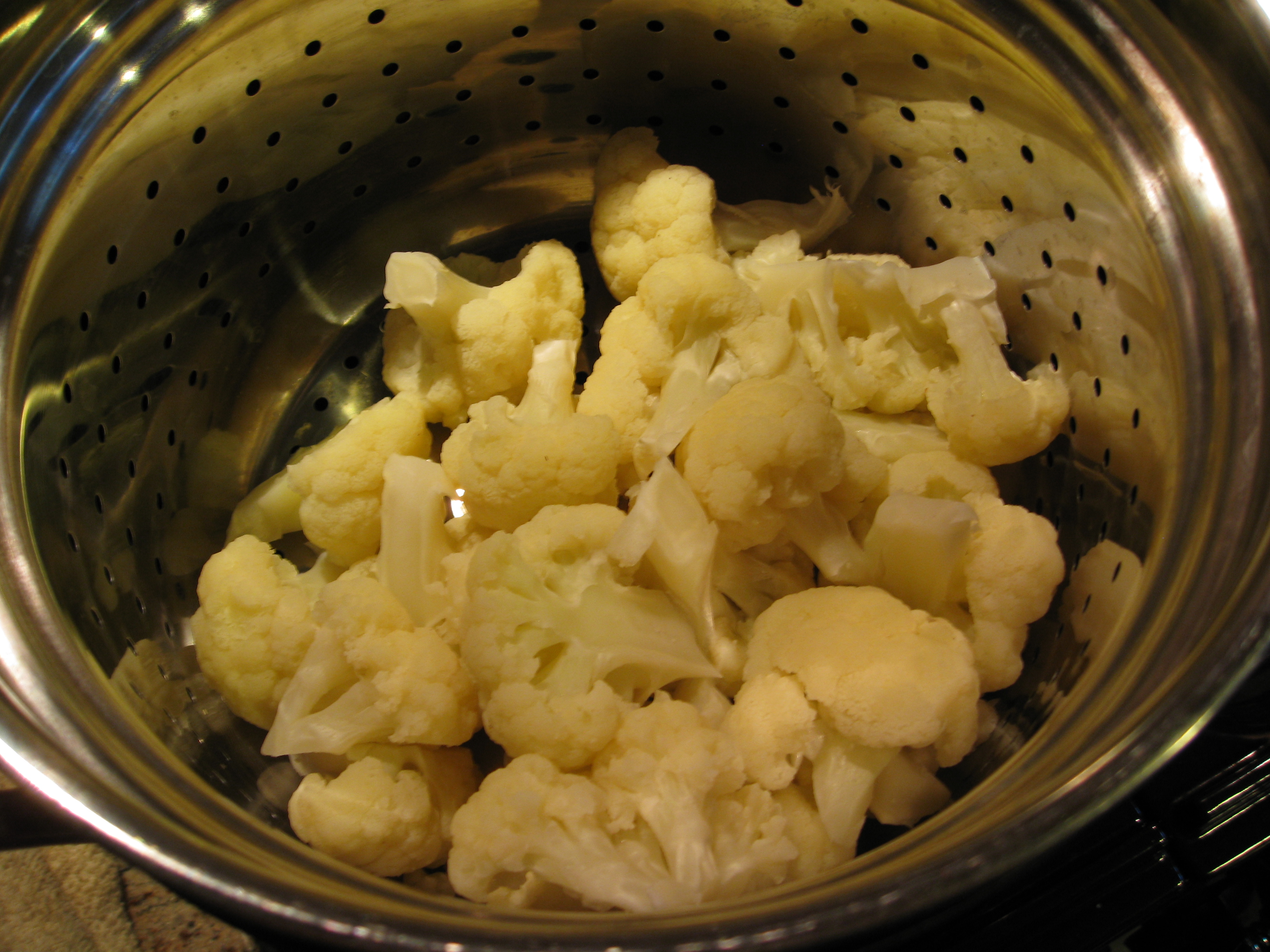 First you make the sauce, which is vegan, by the way. You’d really never know it. We used a steamer basket to steam the cauliflower for about 5-8 minutes. Set it aside after draining it.