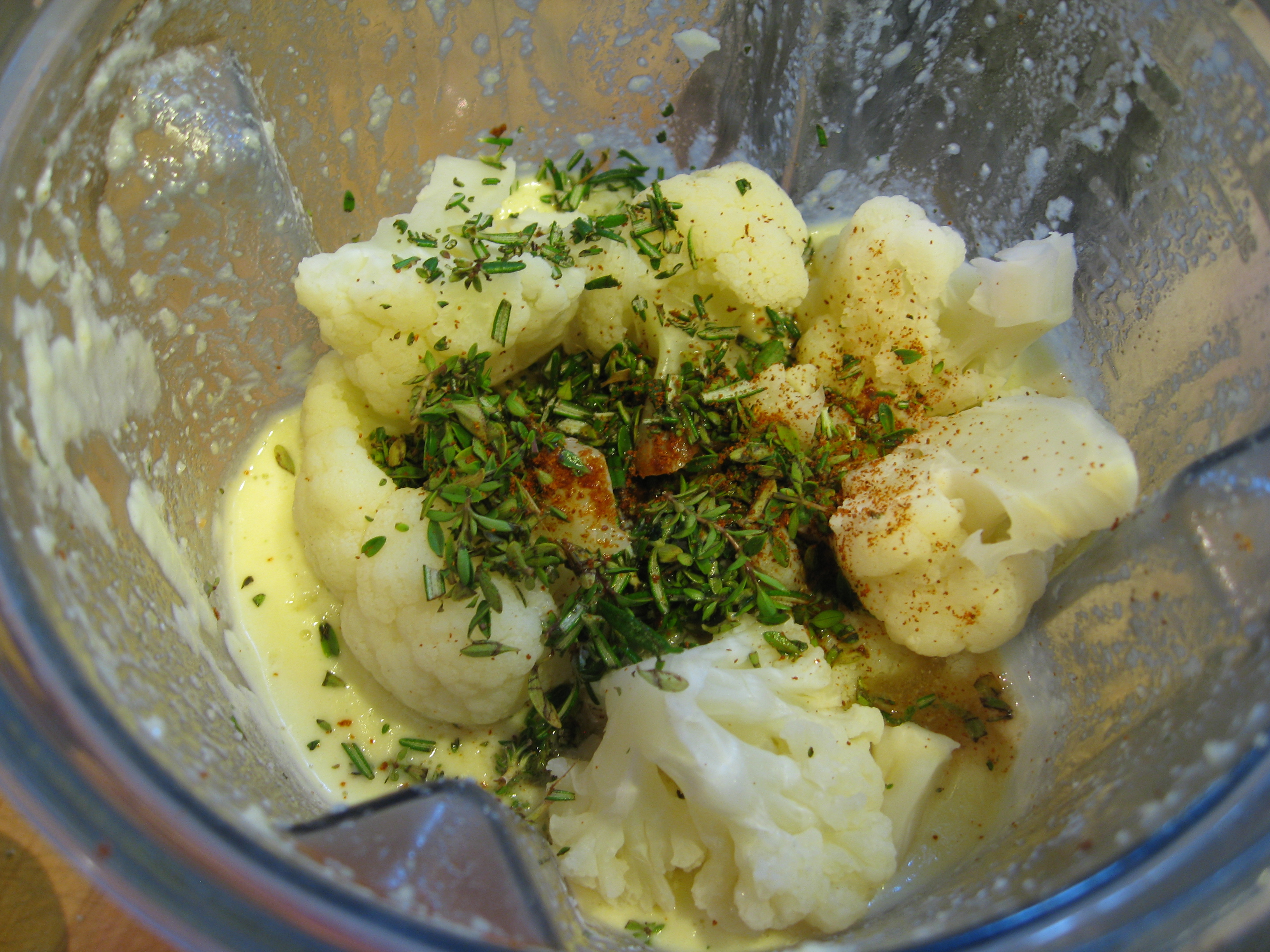 Add the remaining cauliflower, herbs, lemon juice and spices and blend until smooth.