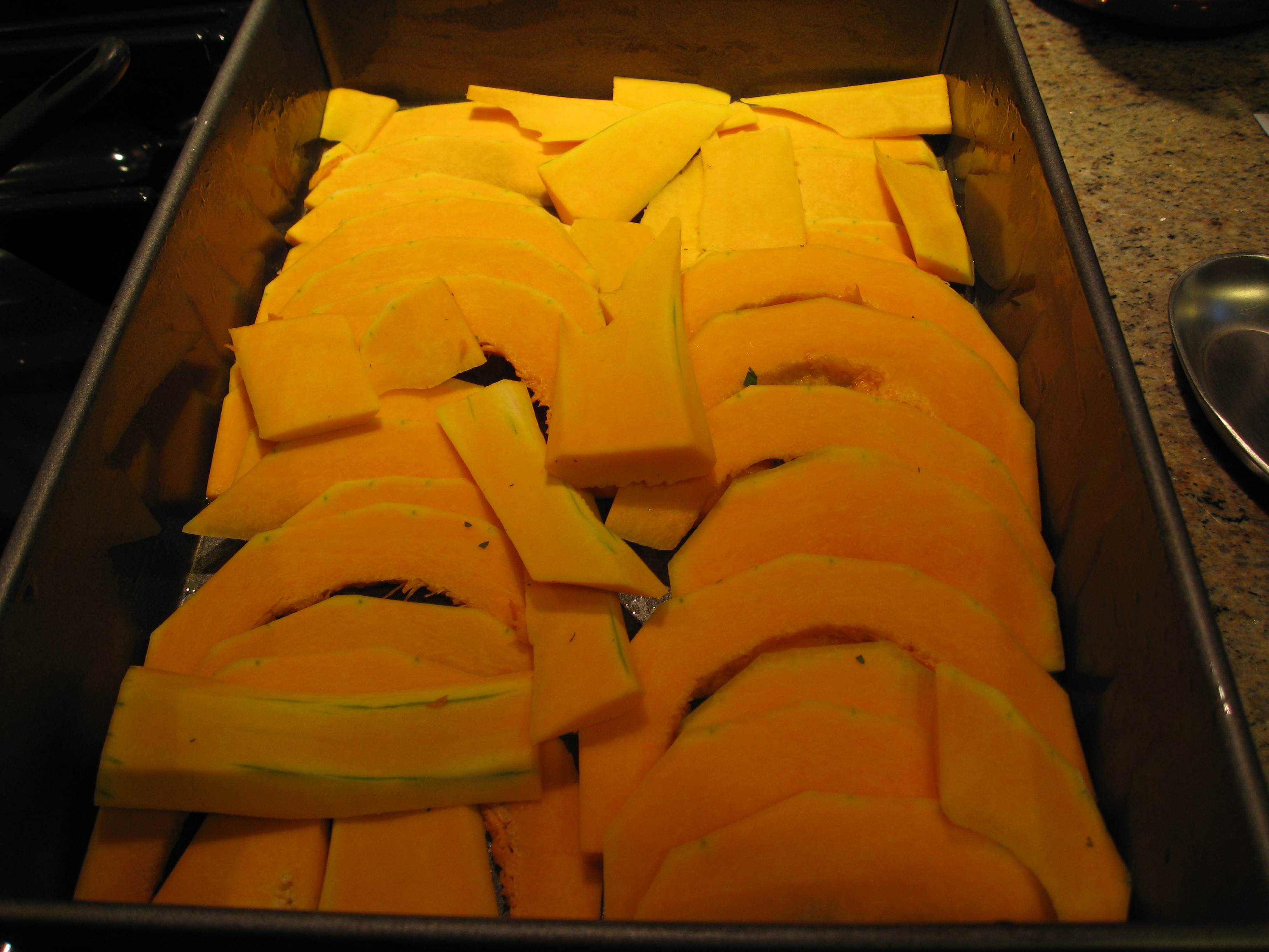 Next, we assemble casserole. Heat the over to 375º F while you do this. Lightly oil a 3 1/2 quart baking dish and put down a layer of overlapping slices of butternut squash on the bottom.