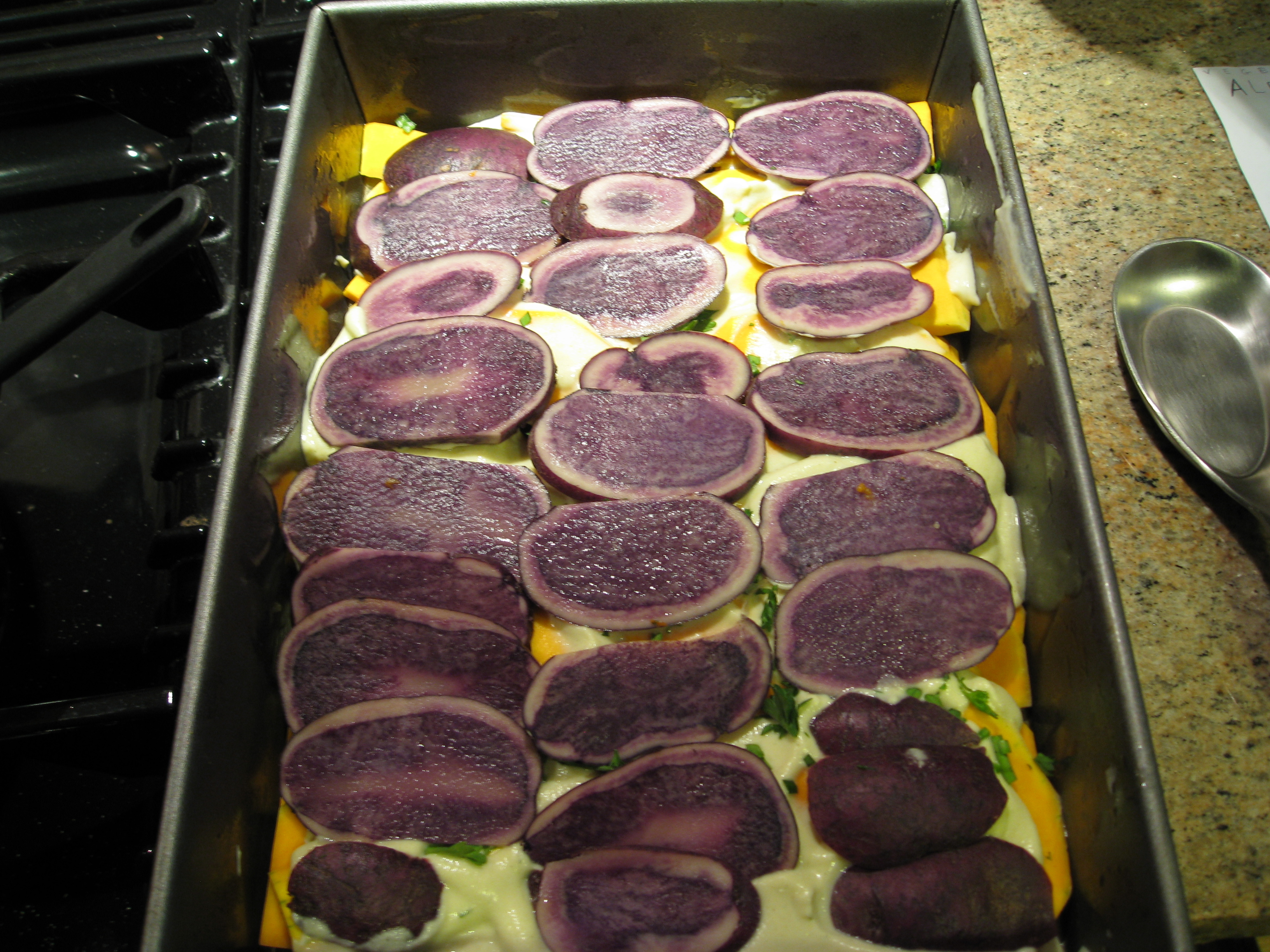 3 large potatoes, very thinly sliced (we used purple potatoes)