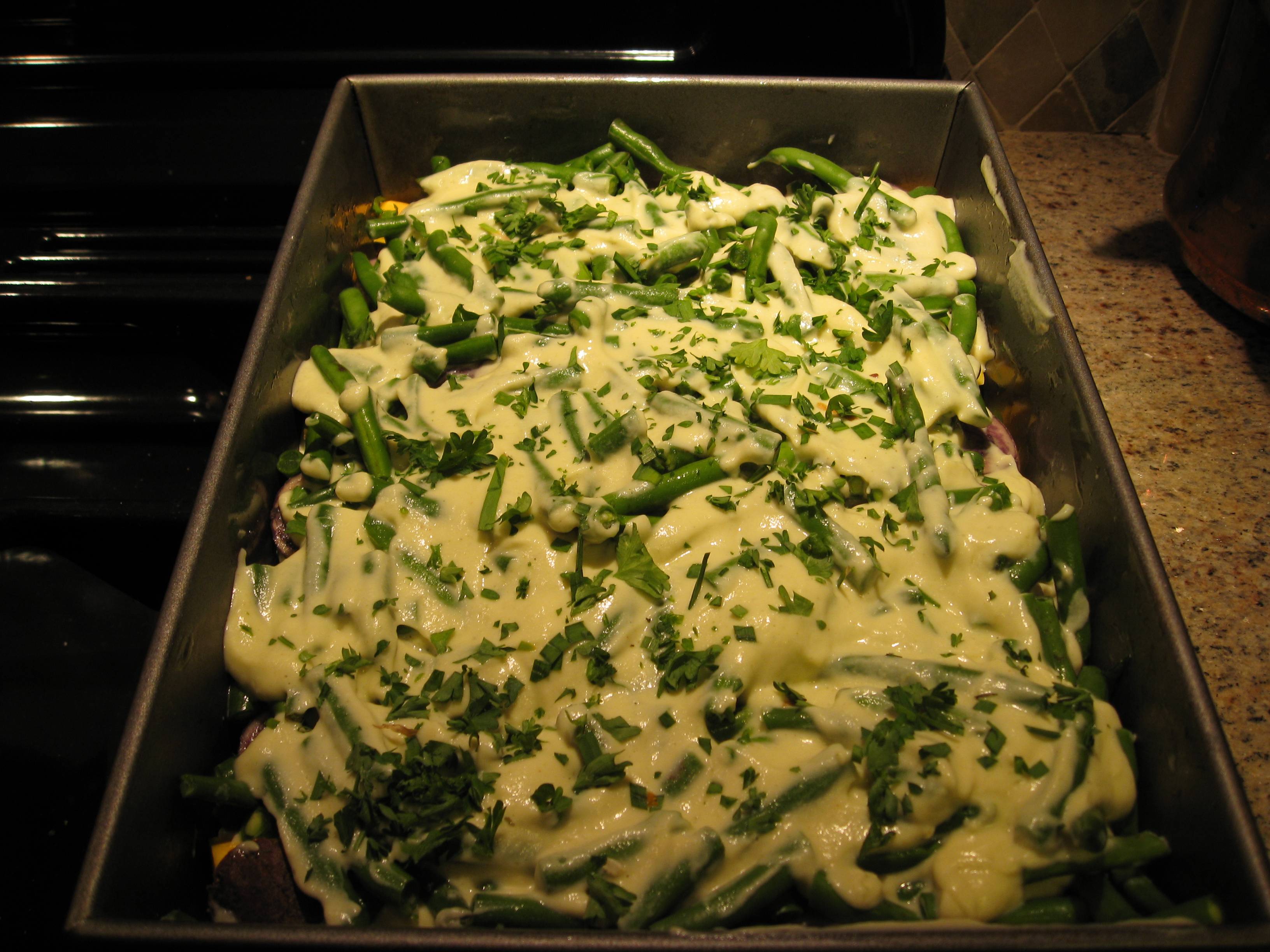 After layering more sauce, herbs and green onions, do that same with the green beans.