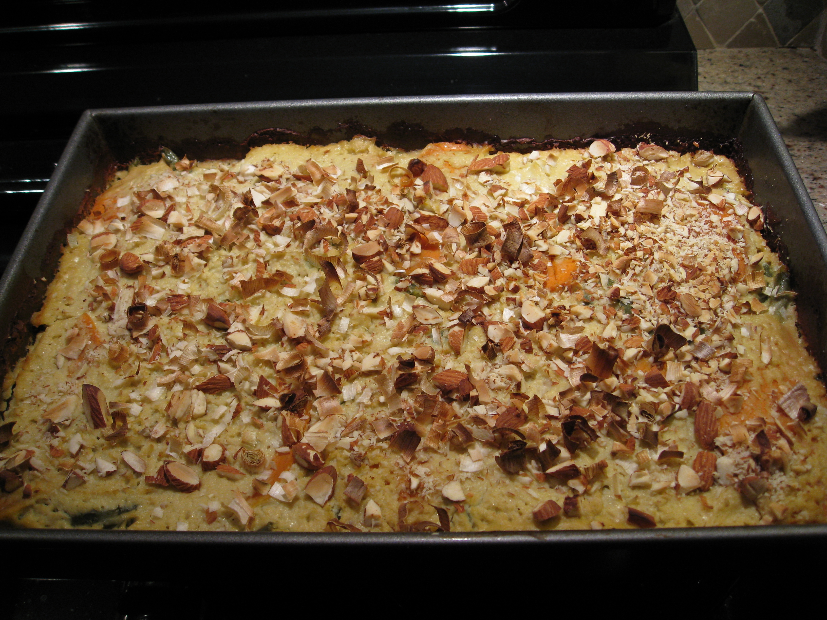 After the initial baking, remove the foil and sprinkle the top with sliced almonds (we made our own, so they’re more chopped than sliced above) and a few tables spoons of dried onions (leeks in our case). Bake for another 15 minutes.