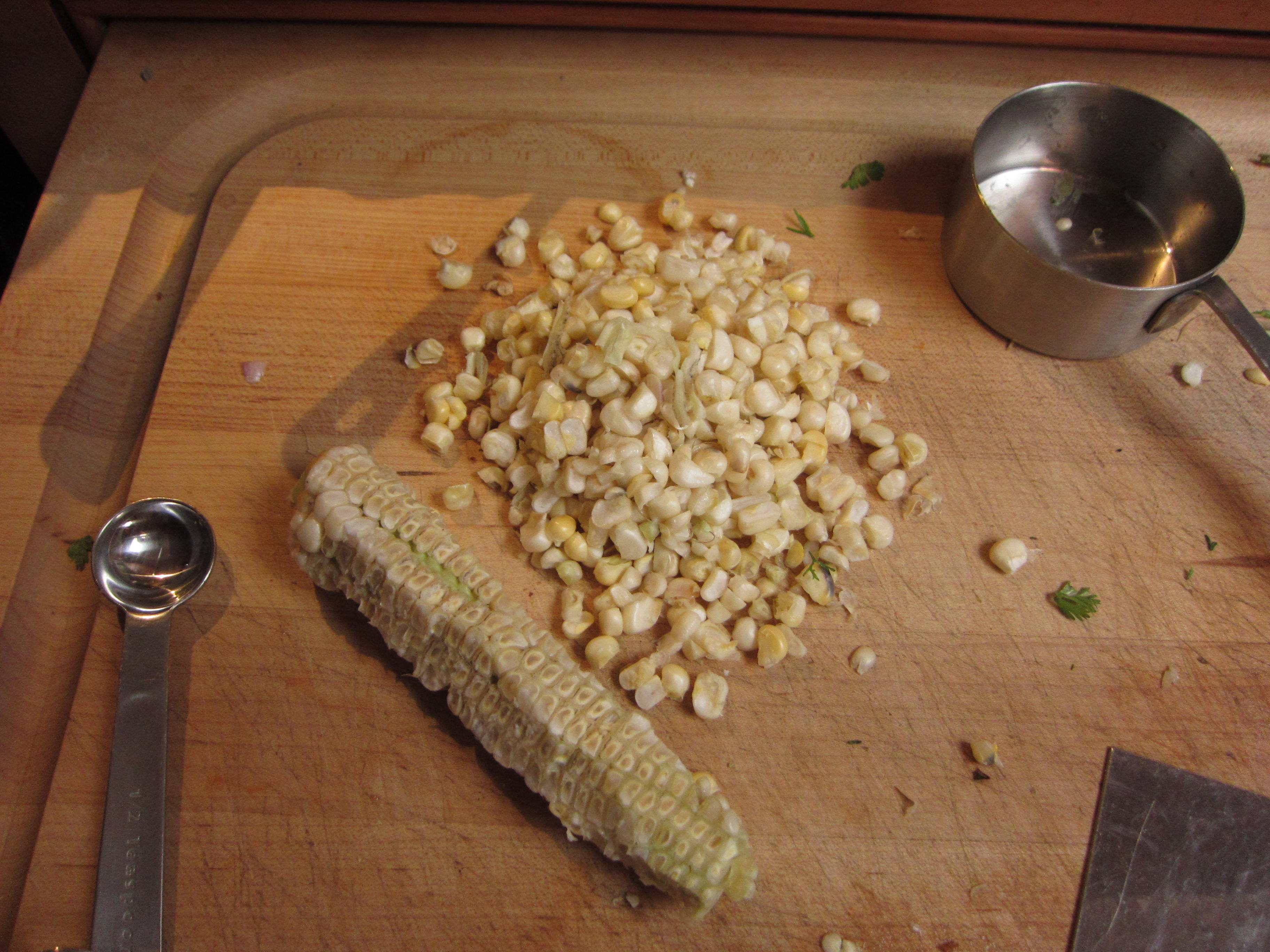 We used the one successful Poblano chile we’ve harvested so far (even though the recipe calls for two), and the last of the cilantro just beginning to bolt to seed. Corn we harvested earlier in the month that was a little too starchy to eat on the cob (waste not want not, right?) was perfect for this recipe.