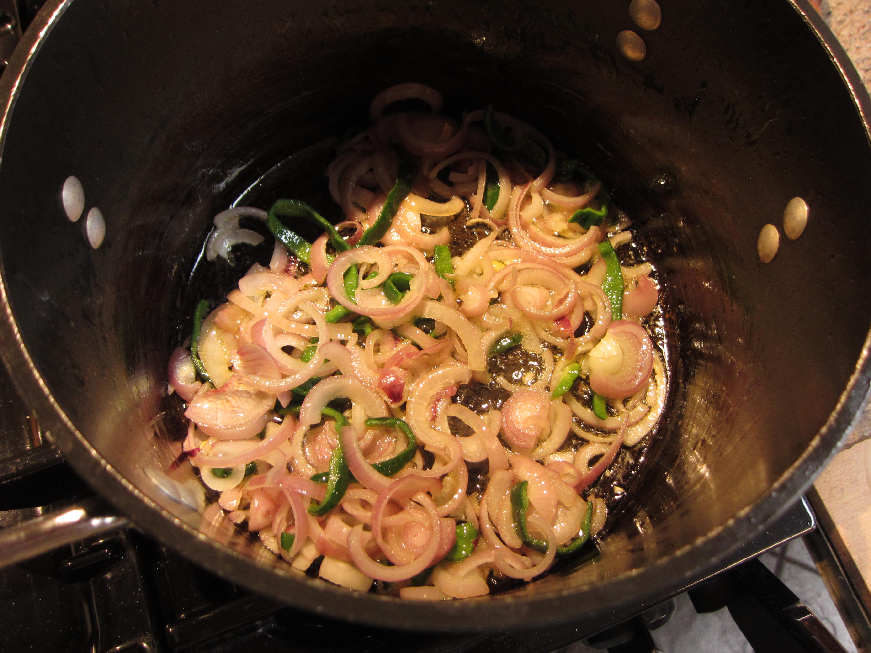 In a large skillet, heat oil and cook onion (we used home-grown red onions because we used up all the tiny white onions we grew this year), and chiles for 10 minutes, until the onion browns a bit.