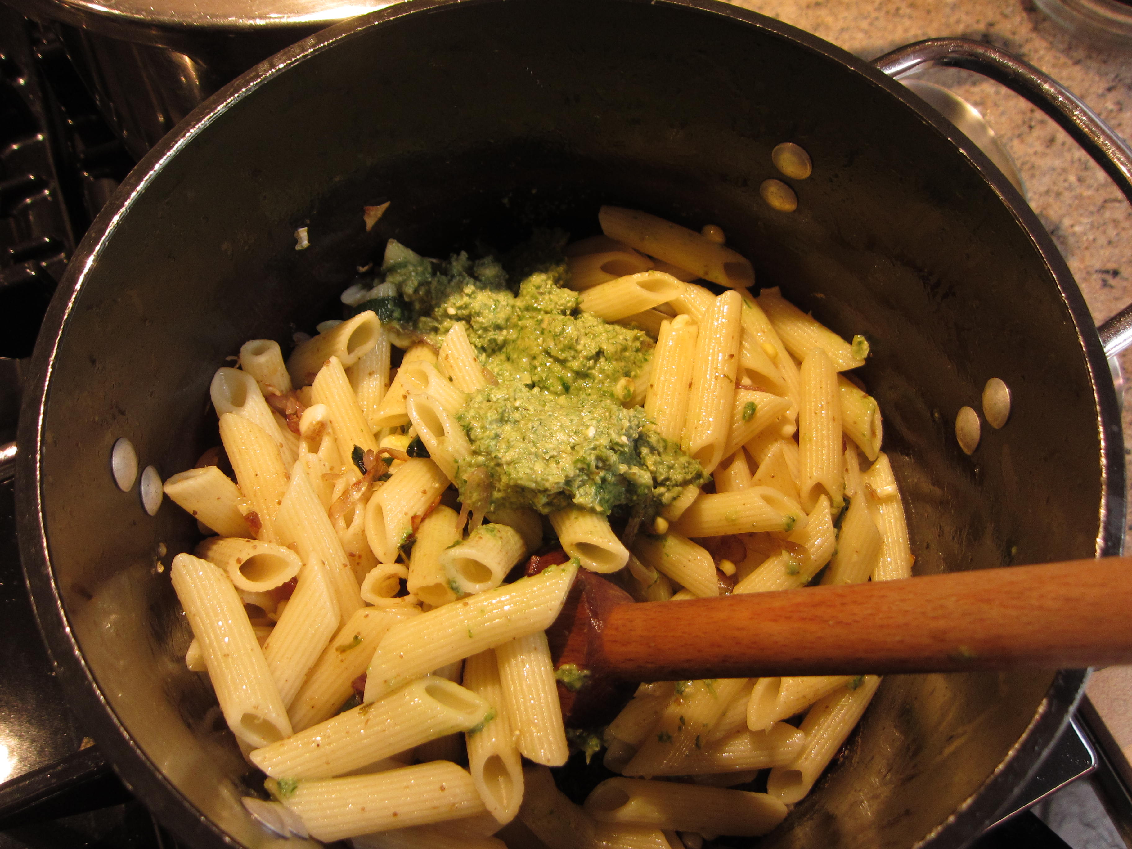 Throw it all in a pan and stir. We used the pasta stockpot to cook the whole meal instead of separate pots for pasta and accoutrements.