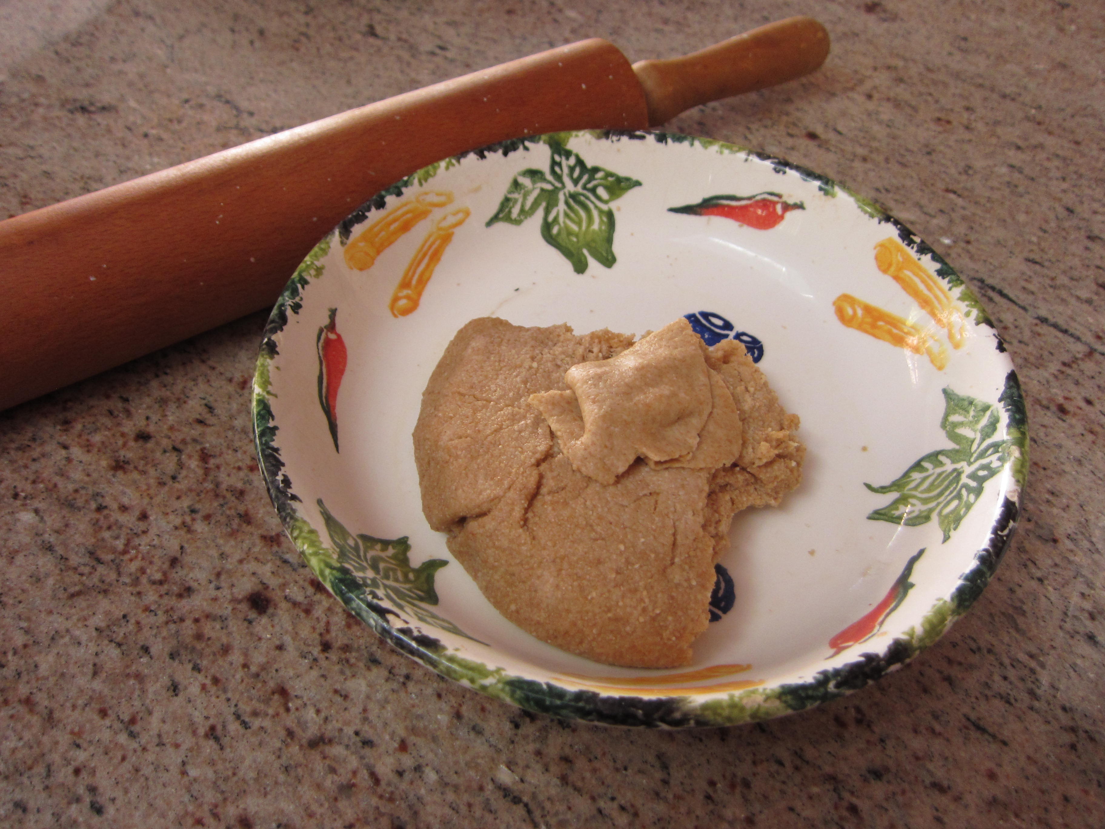 Pull about 1/4 cup of dough off and roll it into a thin sheet.