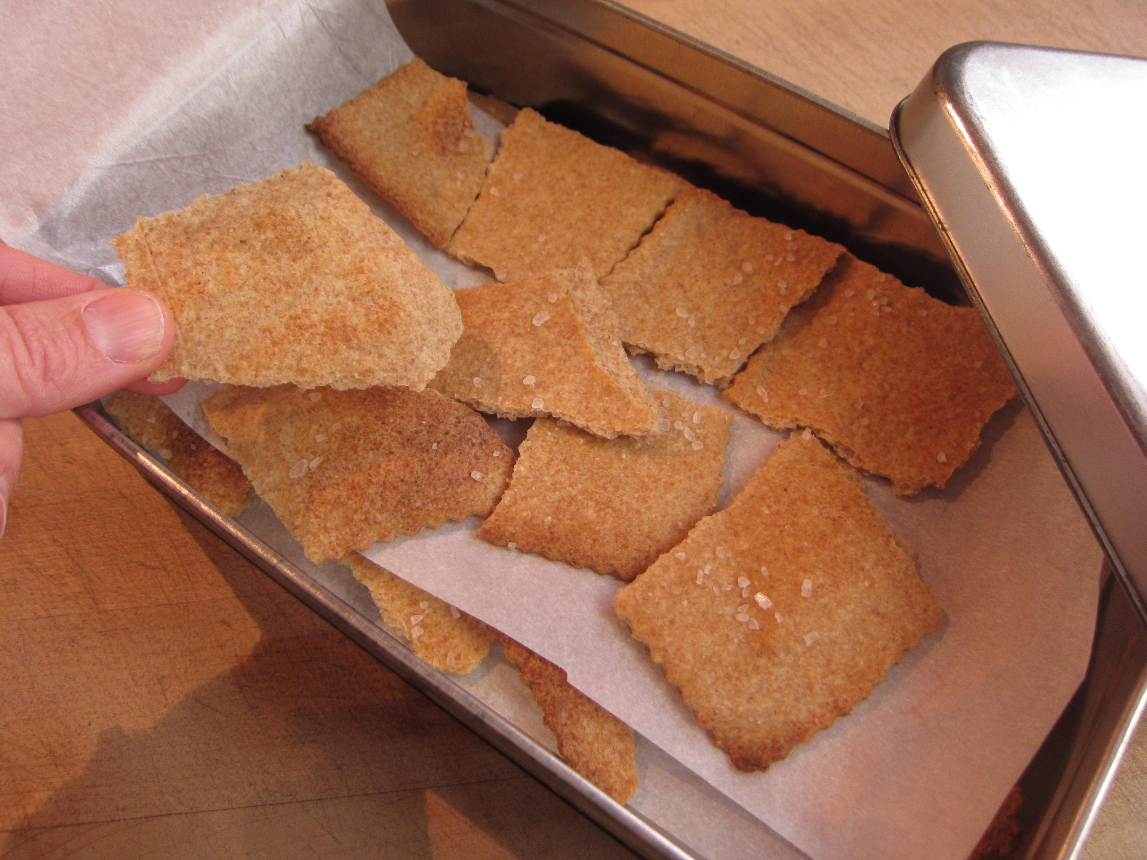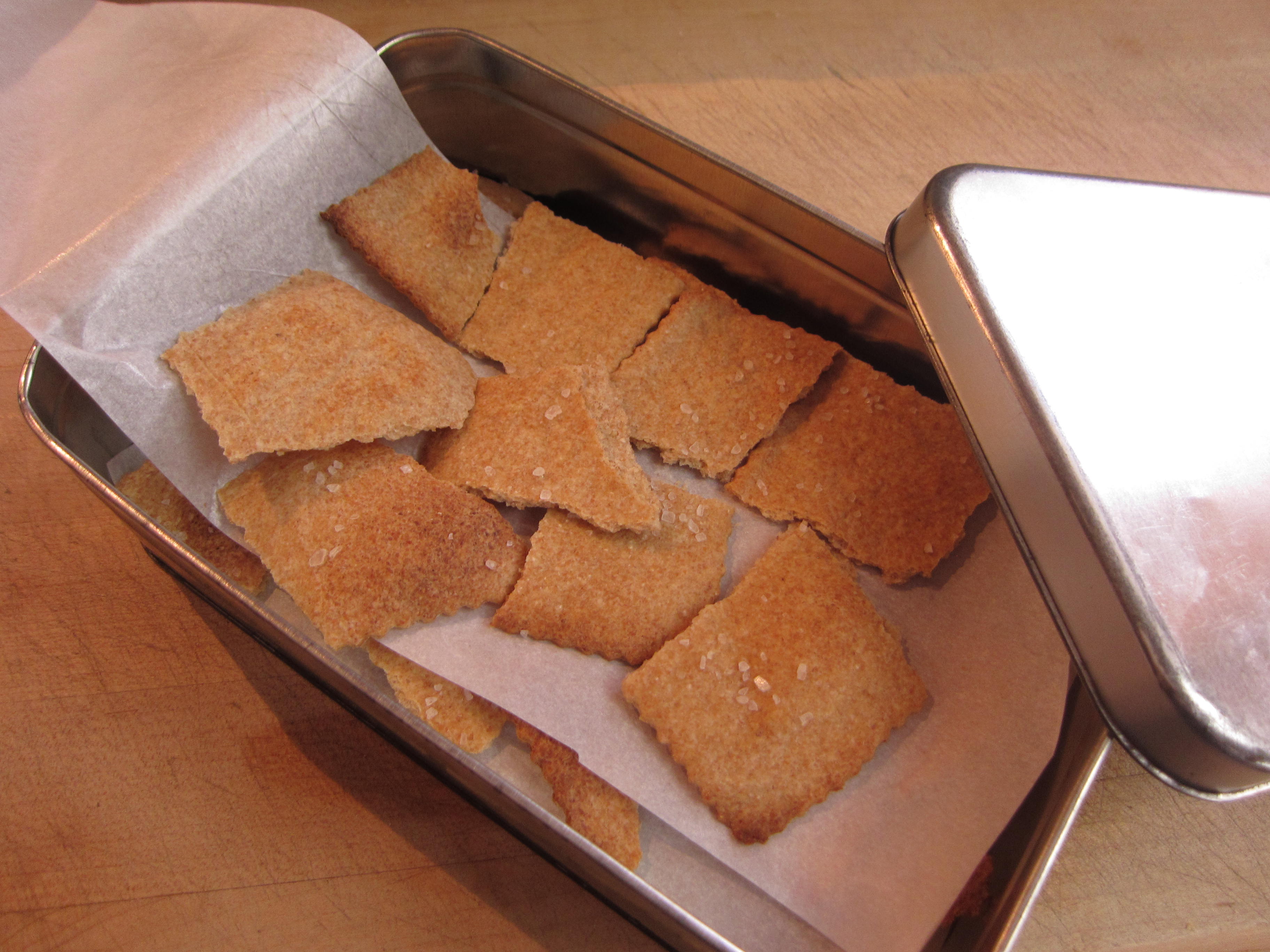 Finished crackers store well in cookie tins. Enjoy them with soft or hard cheese.