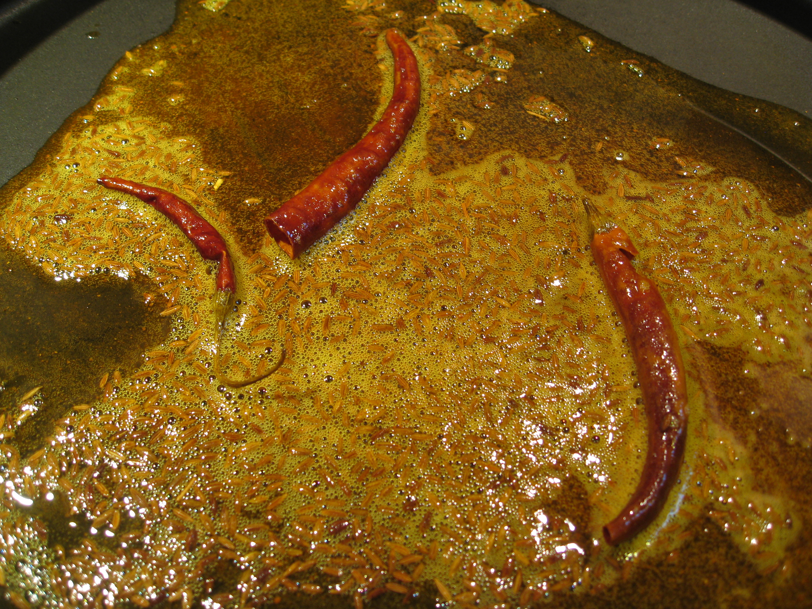 In a large pot (we think a stock pot would’ve been a good idea here) or wok, heat up canola oil and add cumin seeds, turmeric and chile peppers on medium-high heat. Stir often until chile peppers start to turn dark (about 3 minutes).