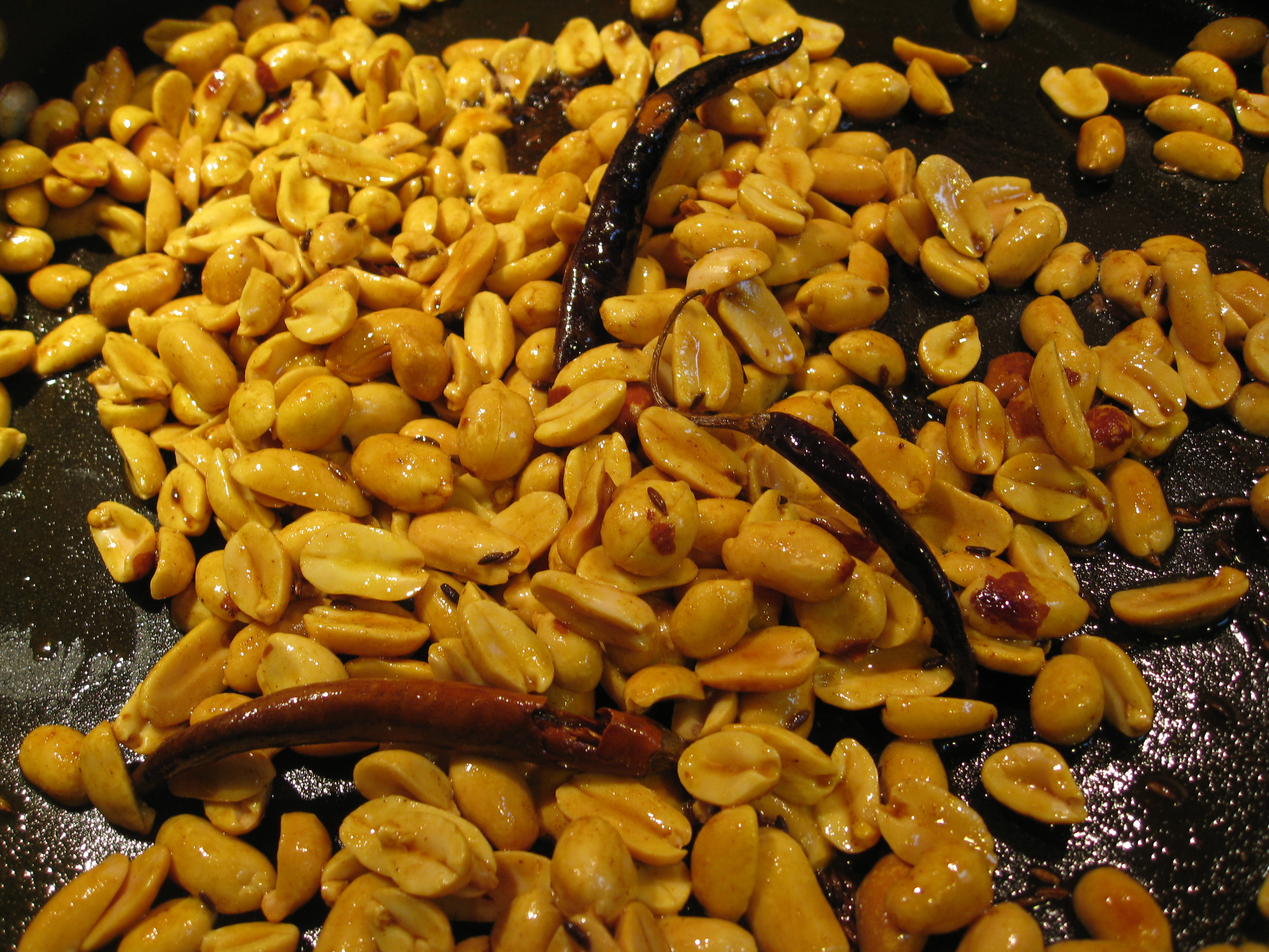 Next, add peanuts and stir occasionally until they turn slightly brown (about 2 minutes).