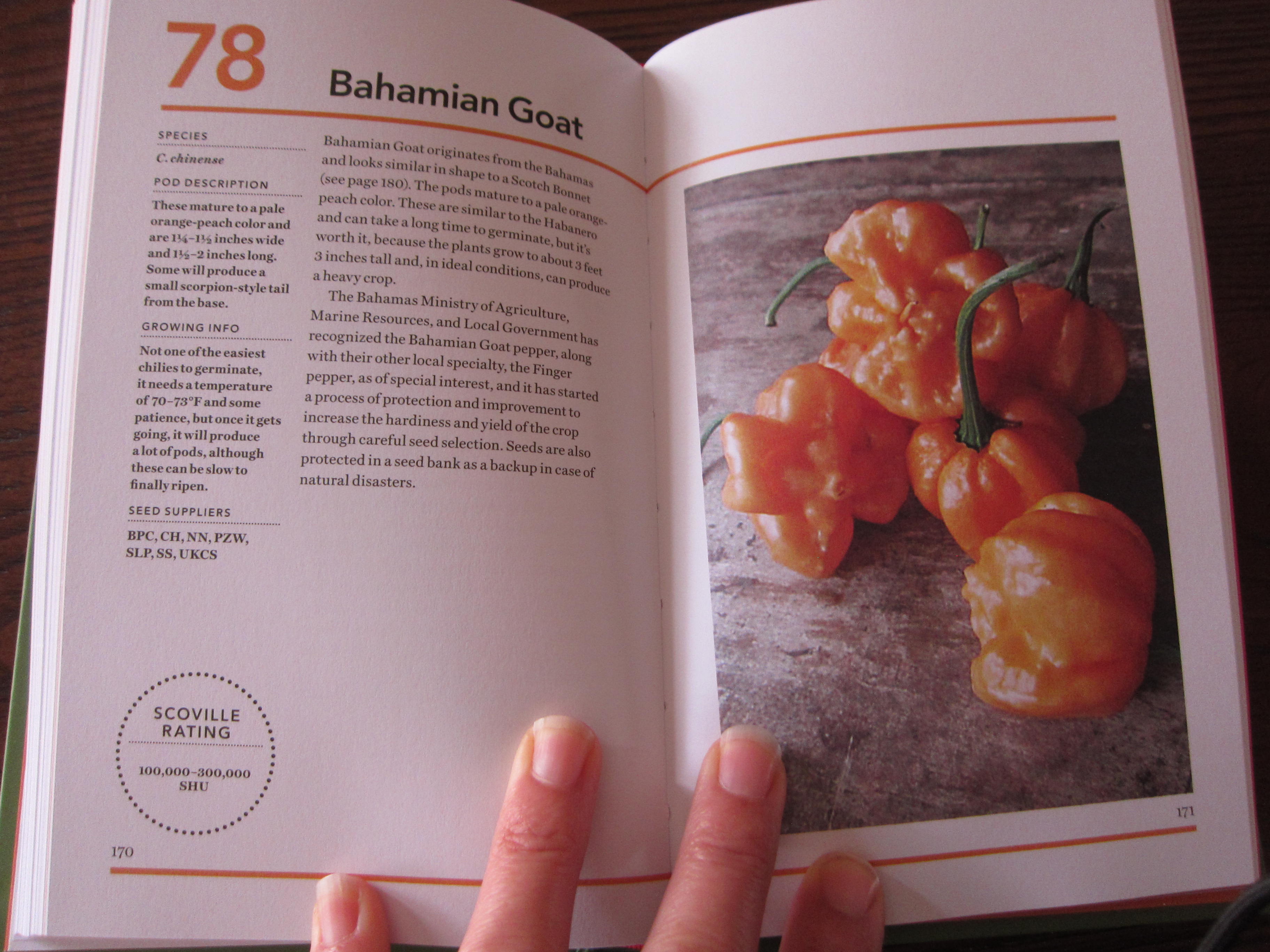 101 Chilies from Firefly Books, LTD. is divided into sections ranging from Sweet and Mild to Superhot, from the 0 Scoville Unit Jimmy Nardello to the Carolina Reaper which peeks at 2,000,000 SU. You can read each 1-page description and see a photo on the facing page. The book is comprised almost entirely of these plant profile pages with short descriptions, Scoville unit ratings, and where to find the seeds. It also lists alternate names for each pepper variety, and includes a fair amount of heirloom and open pollinated varieties along with their origin story or historical data.