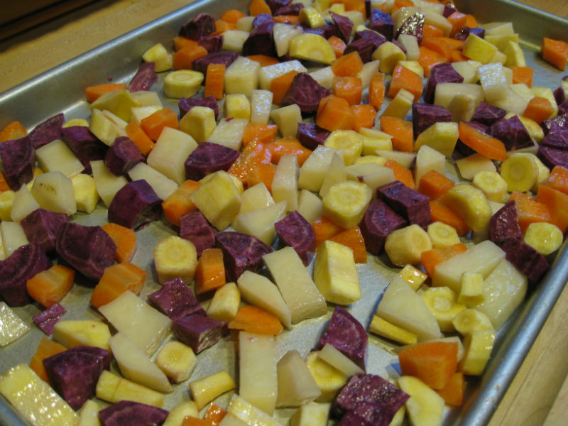 3) Toss together carrots, parsnips, sweet potato, potatoes, 1 Tbsp oil and 1.2 tsp salt in a bowl. Spread on prepared baking sheet and roast for 20 to 30 minutes, until vegetables are browned.