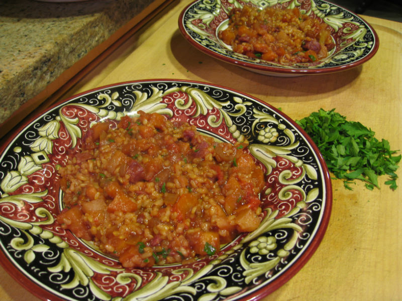 5) Stir roasted vegetables into rice mixture and bring to a boil. Reduce heat to medium-low, cover, and simmer for 40 to 50 minutes. Remove from heat and let stand 10 minutes. Stir in parsley, and season with salt and pepper, if desired. Serve hot or room temperature.