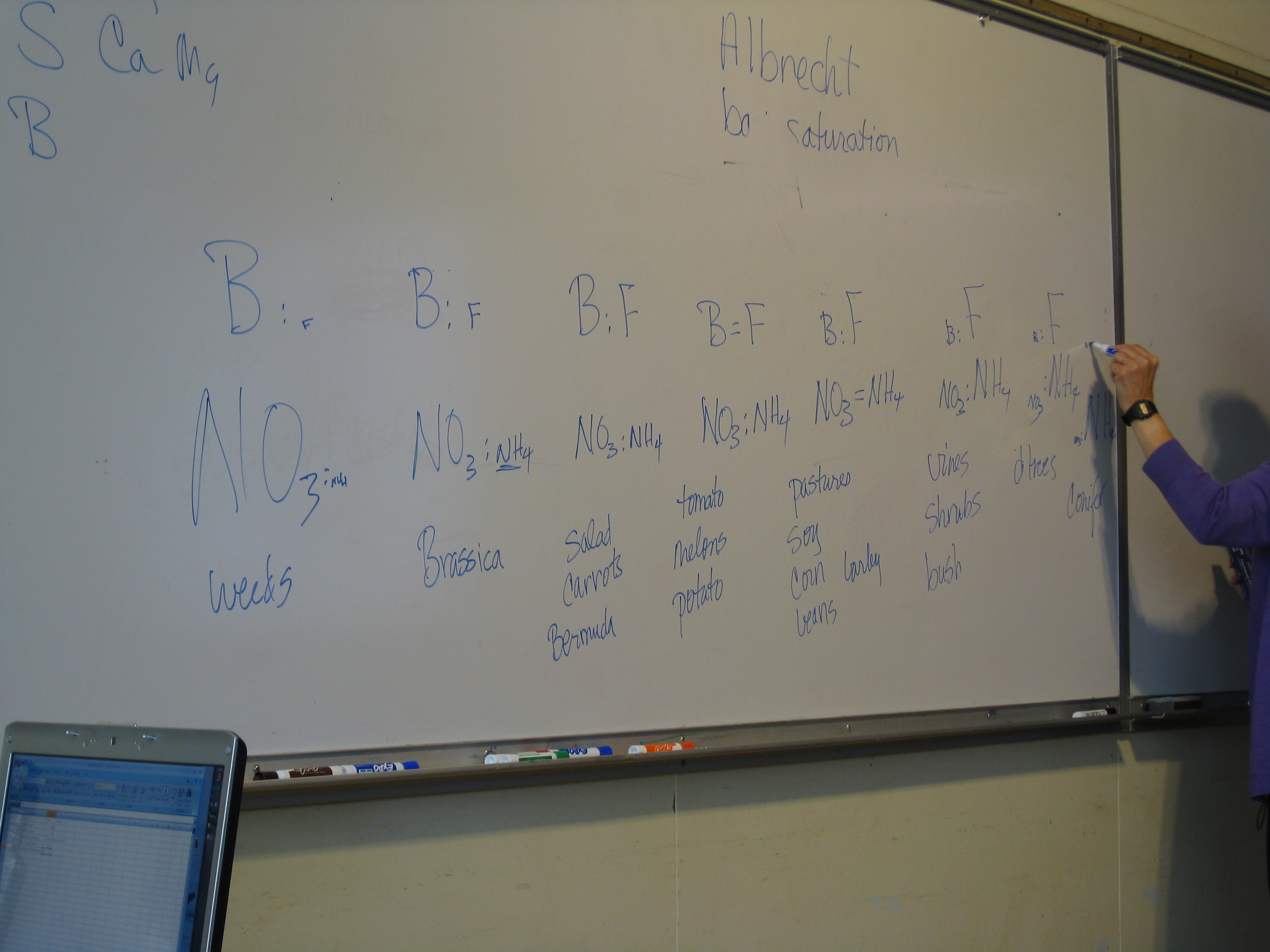 In the image above Dr. Ingham illustrates how the bacteria to fungi ratio (B:F) effects what can be grown in those soils. On the left, bacteria count is high, fungi count is low. This means that the most prevalent nutrient is nitrates (NO3). What grows best in high nitrate situations? Grasses and weeds. (Got weeds in your garden?) As we move more toward forest systems, there is a higher fungi count and lower bacteria count in soils. This means that the most prevalent nutrient is ammonium (NH4), therefore the soil is more acidic. What grows best in these soils? Perennials: shrubs, deciduous trees and conifers.