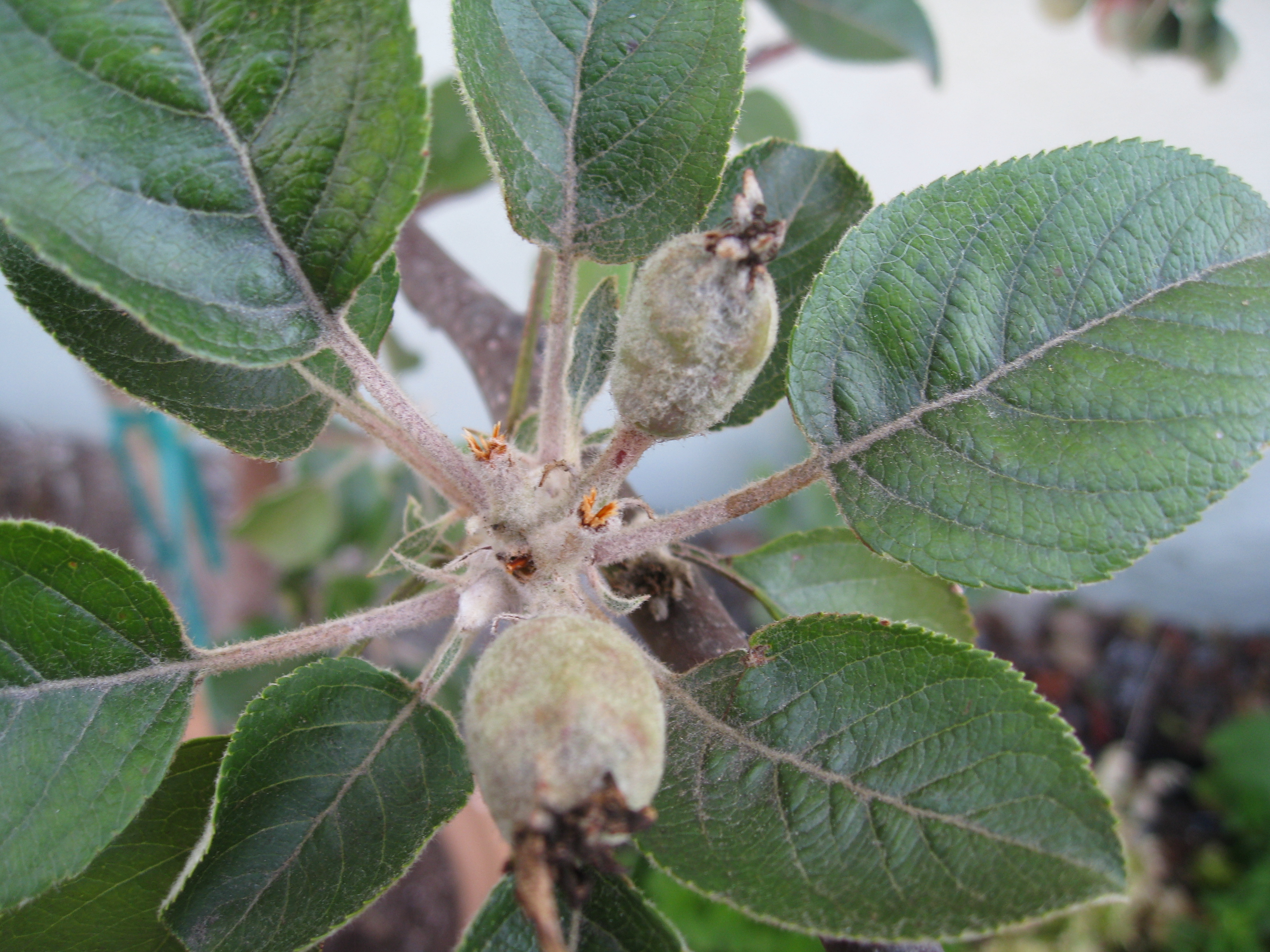 Use shears or simply pinch off the fruit, just be sure to use two hands so you don’t pull off the whole cluster. Also use this time to remove any blossoms that didn’t set fruit (brown debris in the center of the cluster above). Thin out center fruit and leave the outer. By the time the apples reach full size, they’ll be touching.