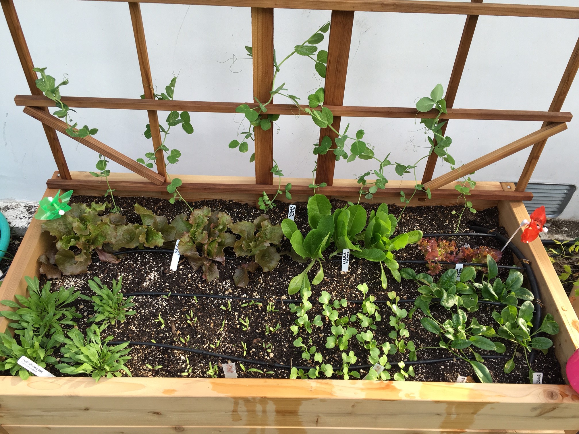 We added a trellis for peas to climb and drip irrigation to make gardening easy on the family. The raised bed planter is just the right height for the little girl to get up close to her plants. The whole thing takes up about 14 square feet, but it’s enough to give the family salad greens and herbs all winter long.