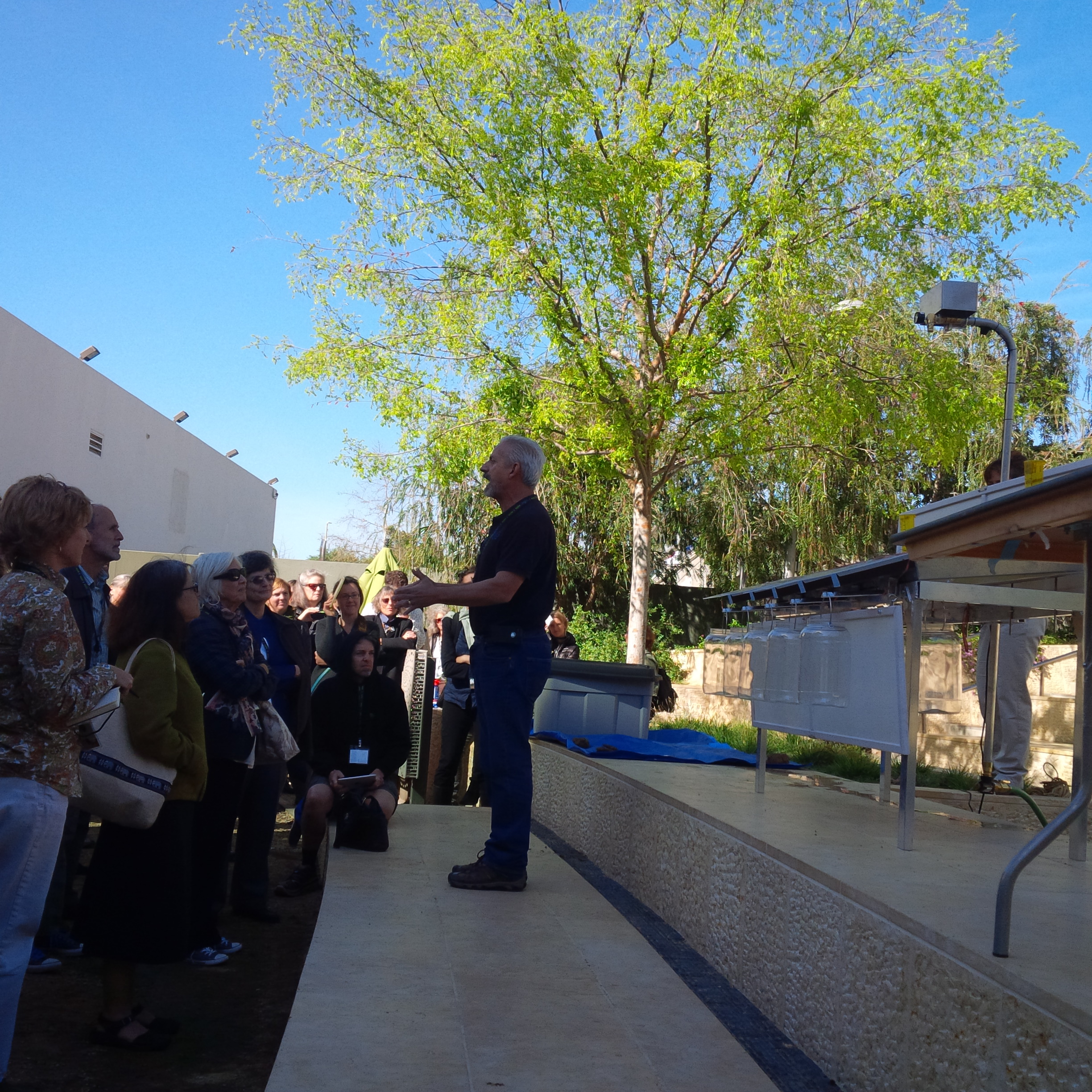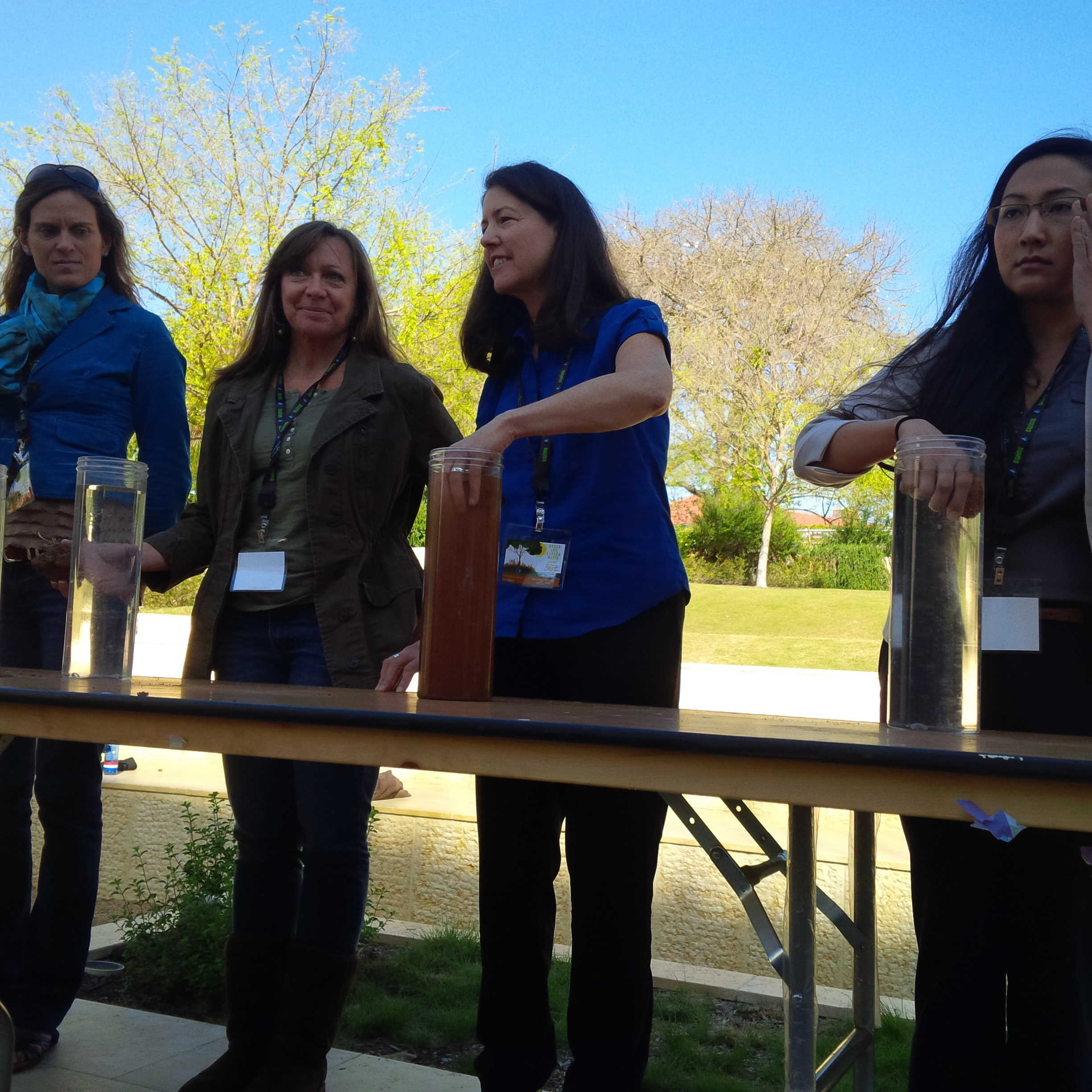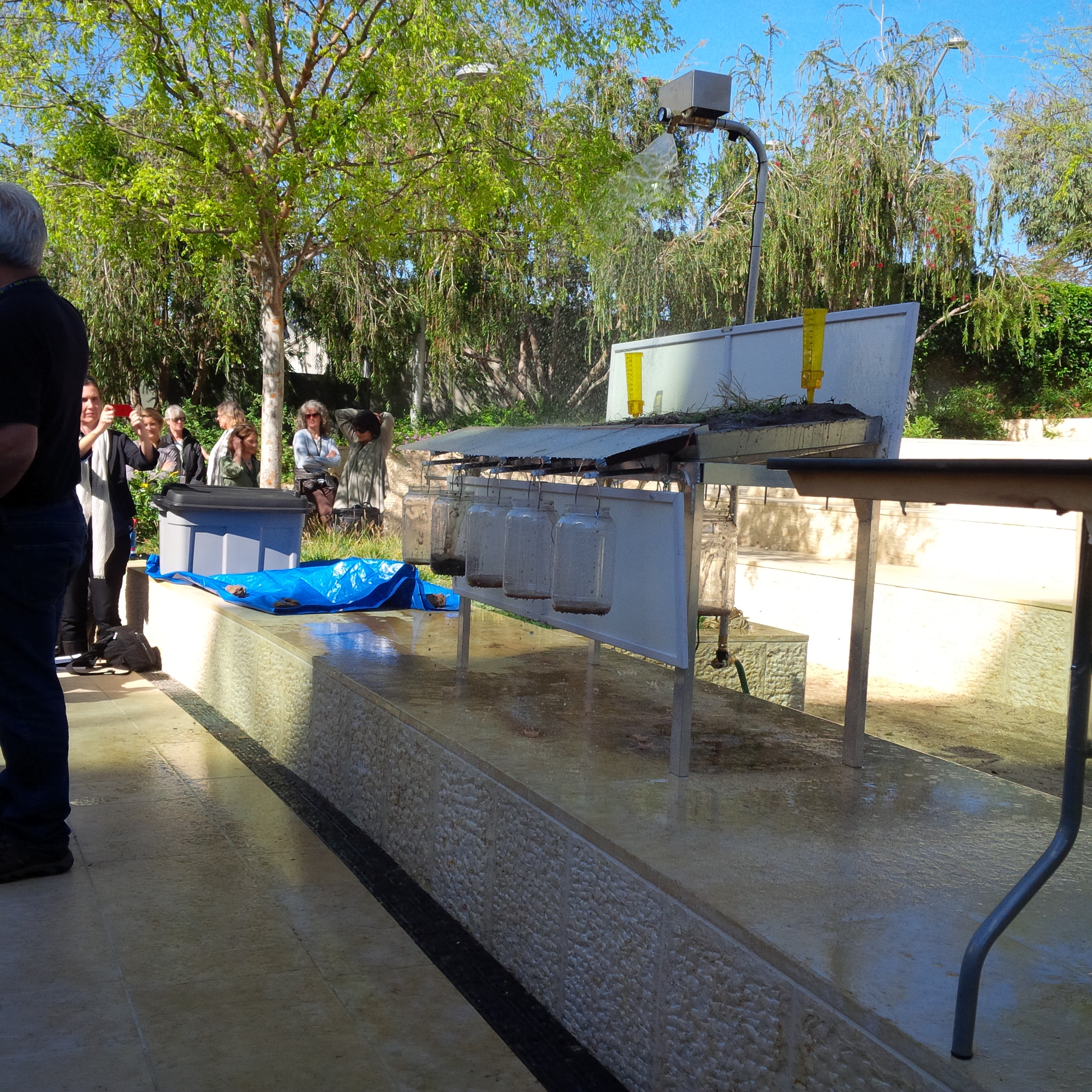 Not surprisingly, Los Angeles city soil showed the most runoff (#2 from the left – bone dry soil can’t absorb moisture). The contraption also has buckets hanging underneath the samples (there are drainage holes on the bottom of each tray) to demonstrate water infiltration of soils. In other words, how much water your soil actually absorbs. The sustainably managed Western Wheat sample showed the most infiltration (least amount of water in the bucket).