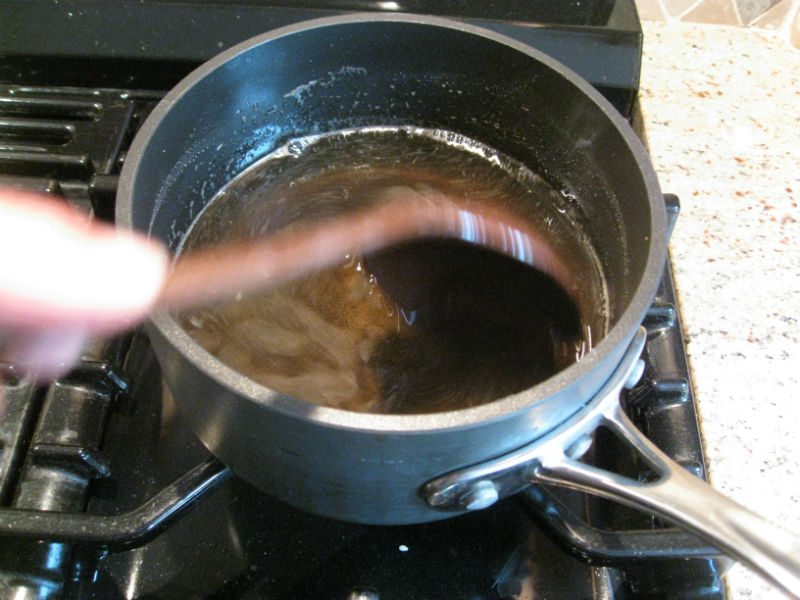 First, bring the sugar and water to a boil in a saucepan until completely dissolved. Then remove from heat and allow to cool. The recipe recommends refrigerating the mixture, but we put ours over an ice bath to cool more quickly.