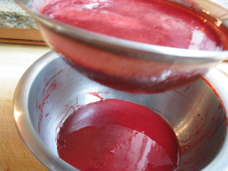 Next, wash and puree your blackberries. (The recipe calls for frozen berries, thawed. So if you don’t have fresh, feel free to follow those instructions). Strain the blackberries through a fine sieve to remove seeds and pulp.