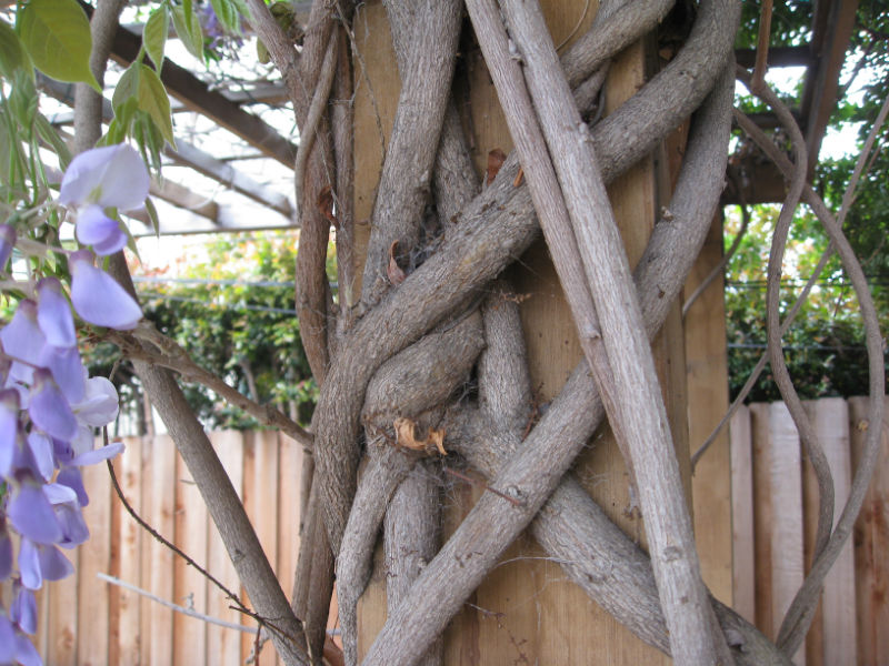 Wistaria needs a trellis and if you don’t give it one, it will make its own. It wraps around posts like a python, and over time it will crush those dainty wooden trellises so well-intentionally placed.