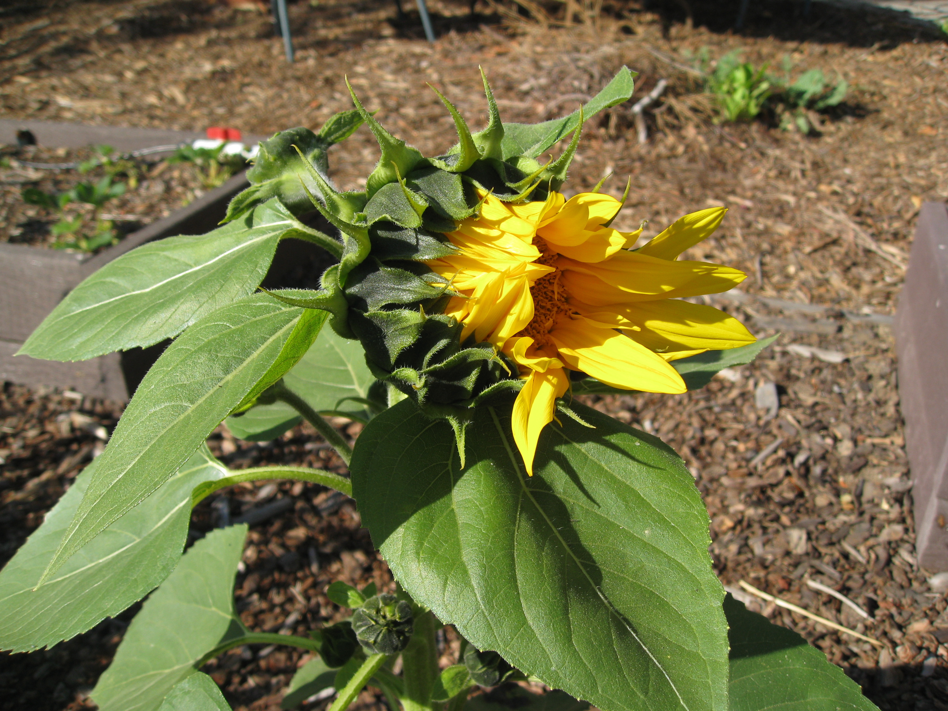 A volunteer sunflower begins to open. We’ve tried growing them deliberately for years and it never works. Now we have 3 volunteers and we’re leaving them.