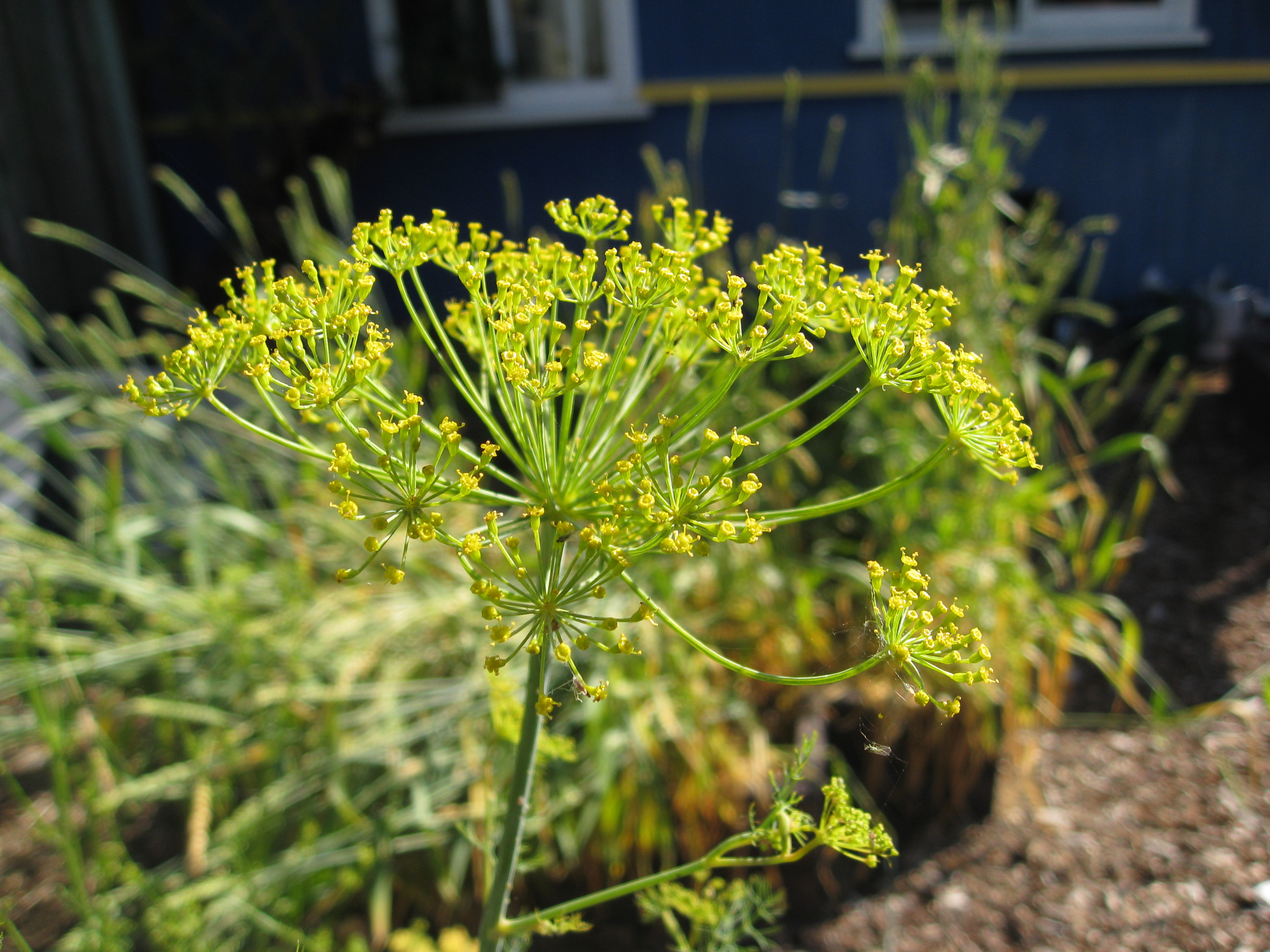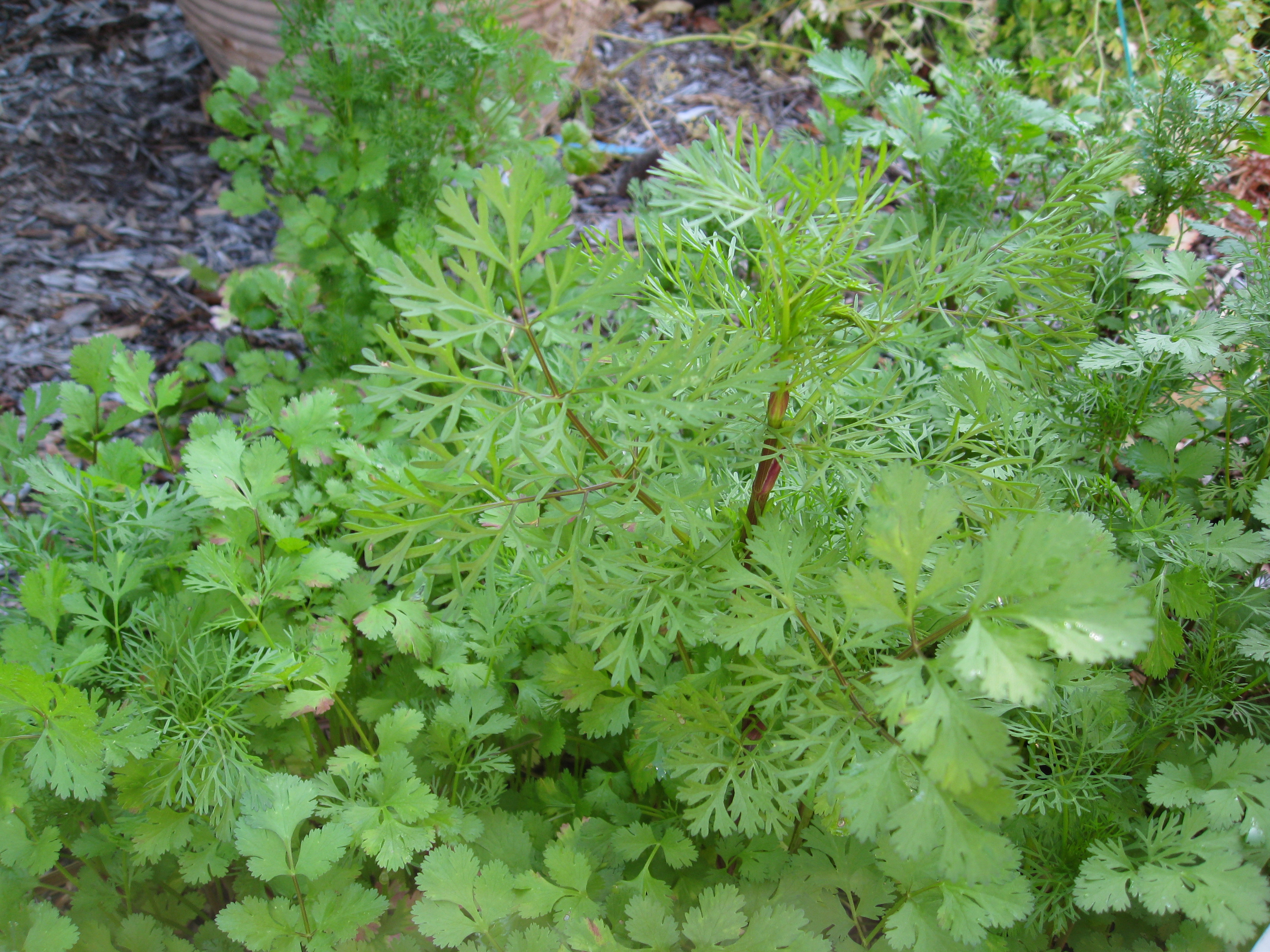 Volunteer cilantro bolts to seed. We’ll harvest and puree with a little oil and freeze it for later.