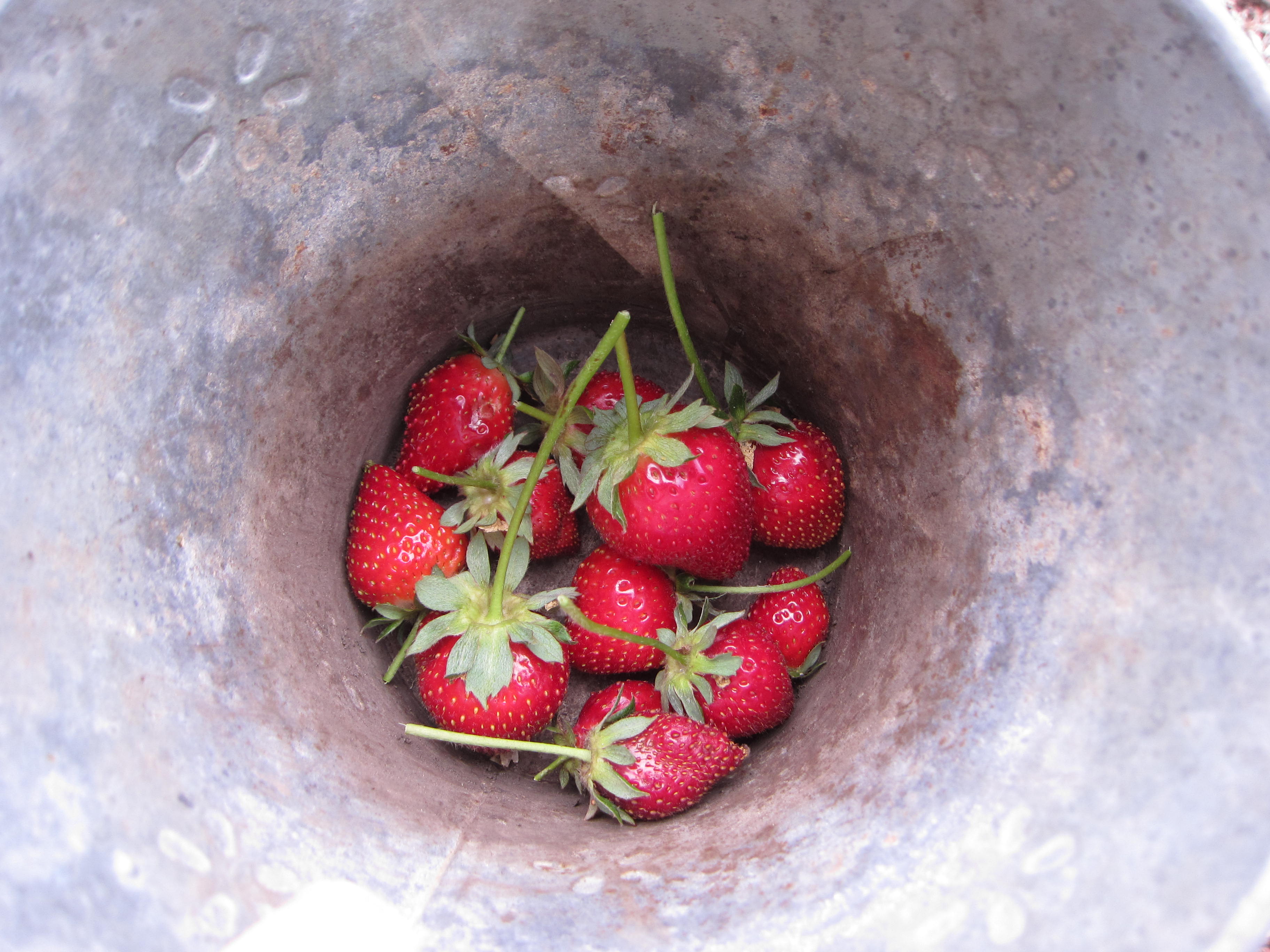 Fresh strawberries from everbearing plants. We love Seascapes! Feed with kelp emulsion every two weeks.