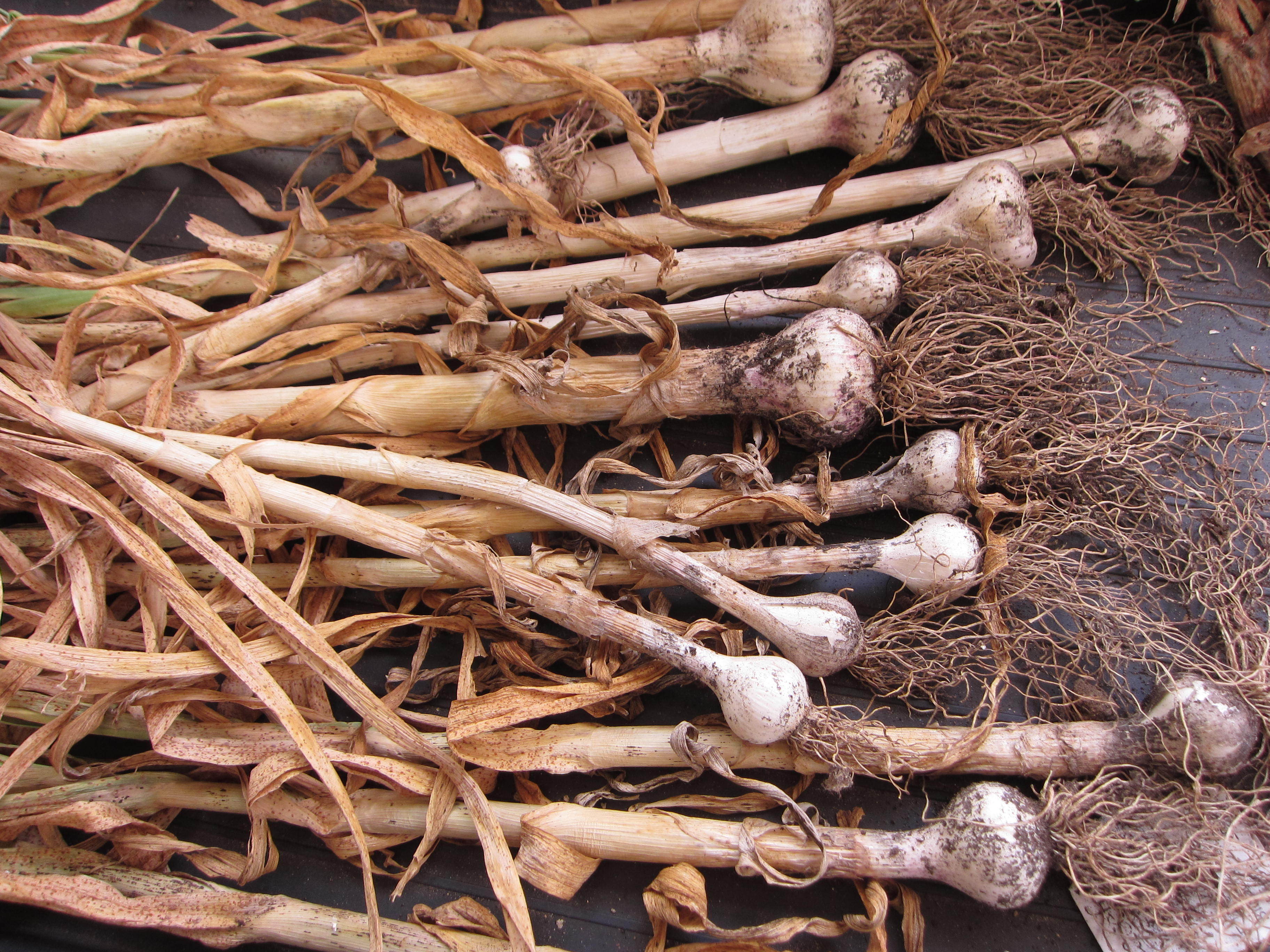 Our garlic harvest cures on trays. We pulled them to make room for tomatoes. Soon we’ll braid these bulbs (after 4-5 weeks) and hang them in the kitchen.