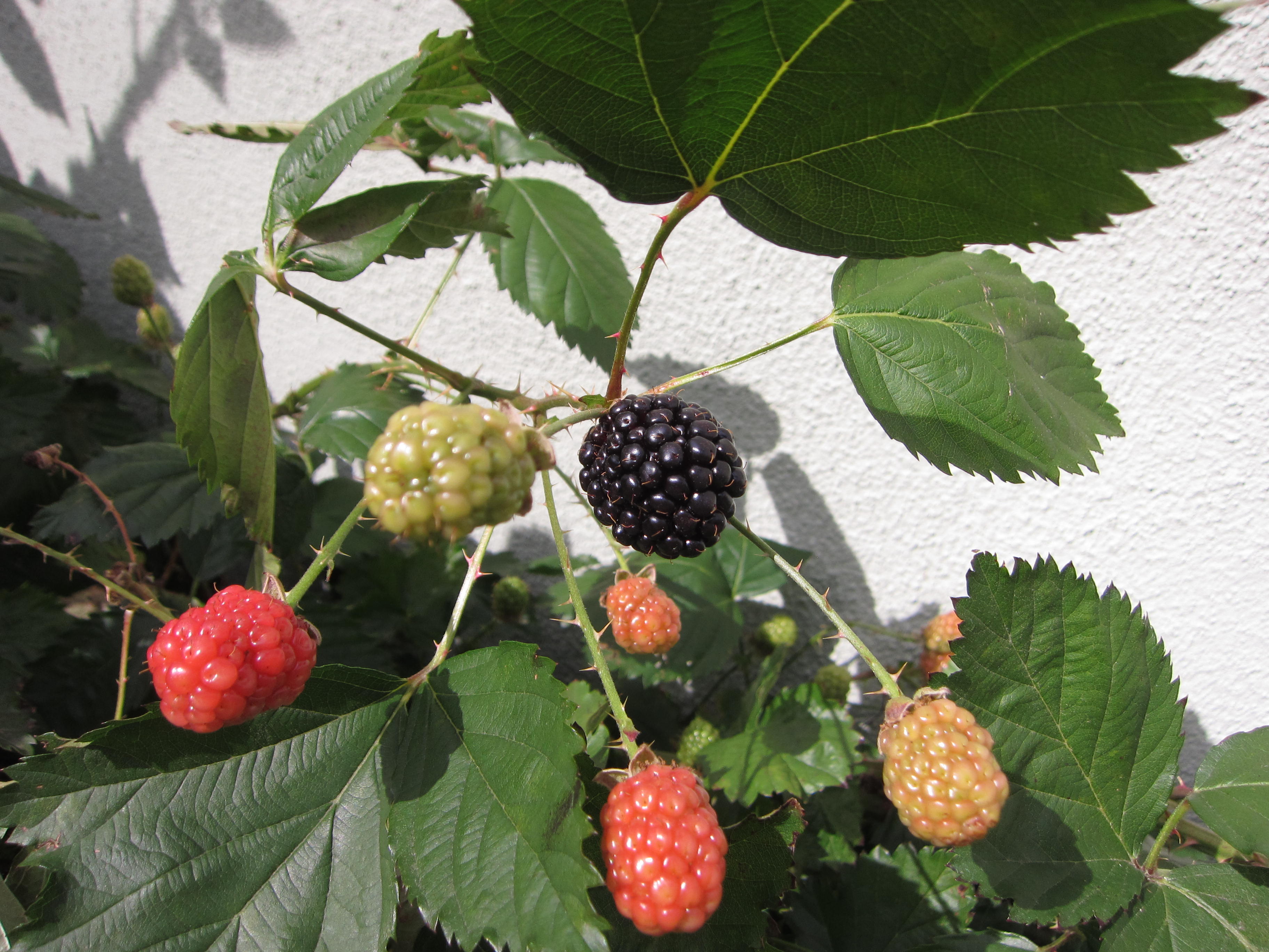 Our first blackberries stake their claim in the sun. Tip pruning can encourage another crop in fall.