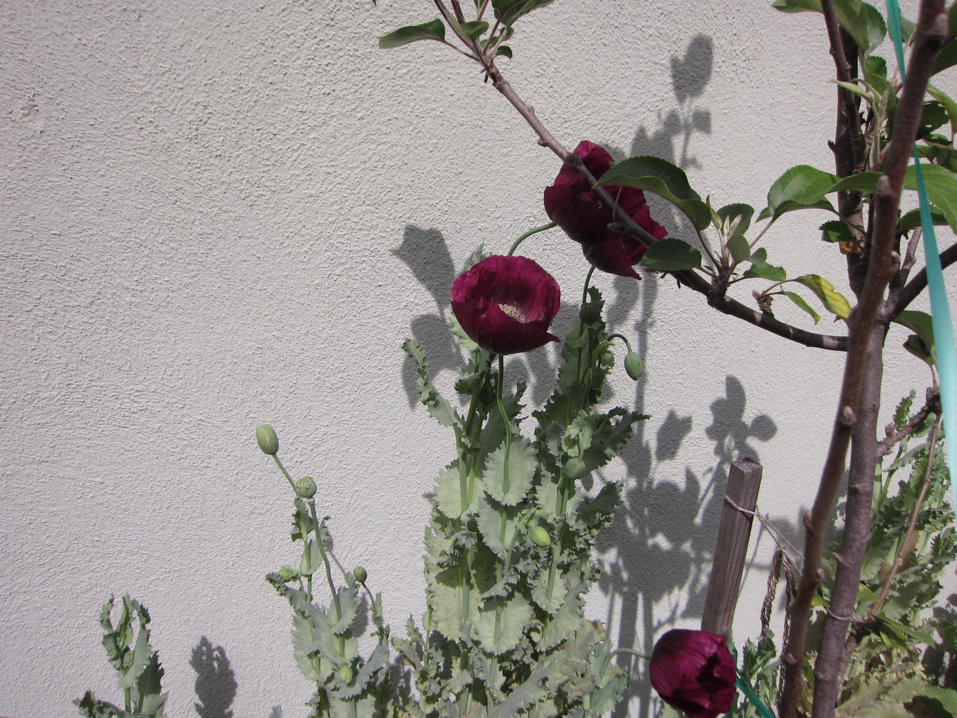 Lauren’s Grape poppies intertwine with a Fuji apple tree. We’ll let the seeds scatter for more poppies next year.