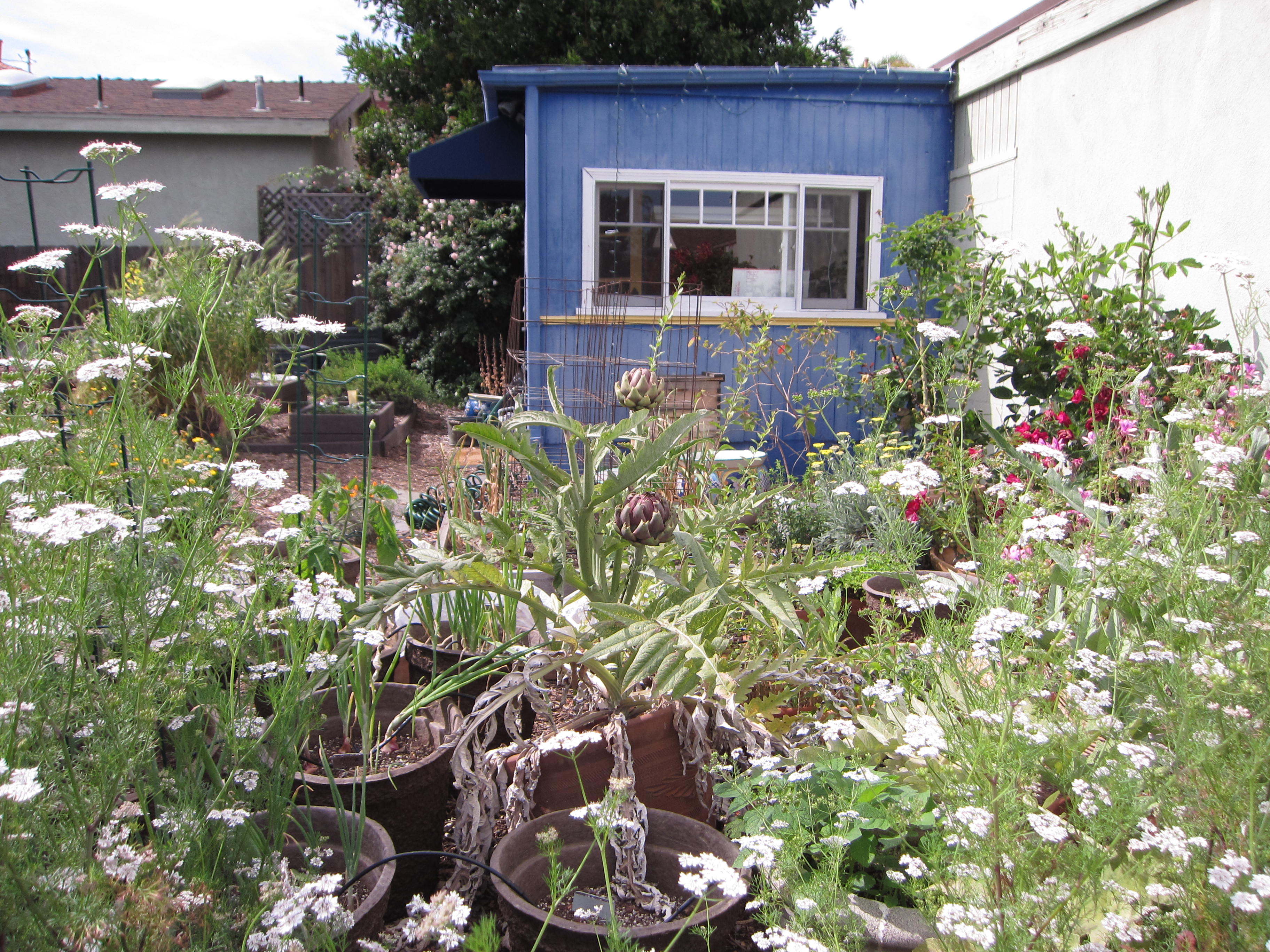 We’re letting a couple Winnetka Purple artichokes flower so we can save the seeds for the Seed Library of Los Angeles. Cilantro bolts to seed nearby, attracting good bugs to the garden. Volunteers are the best!
