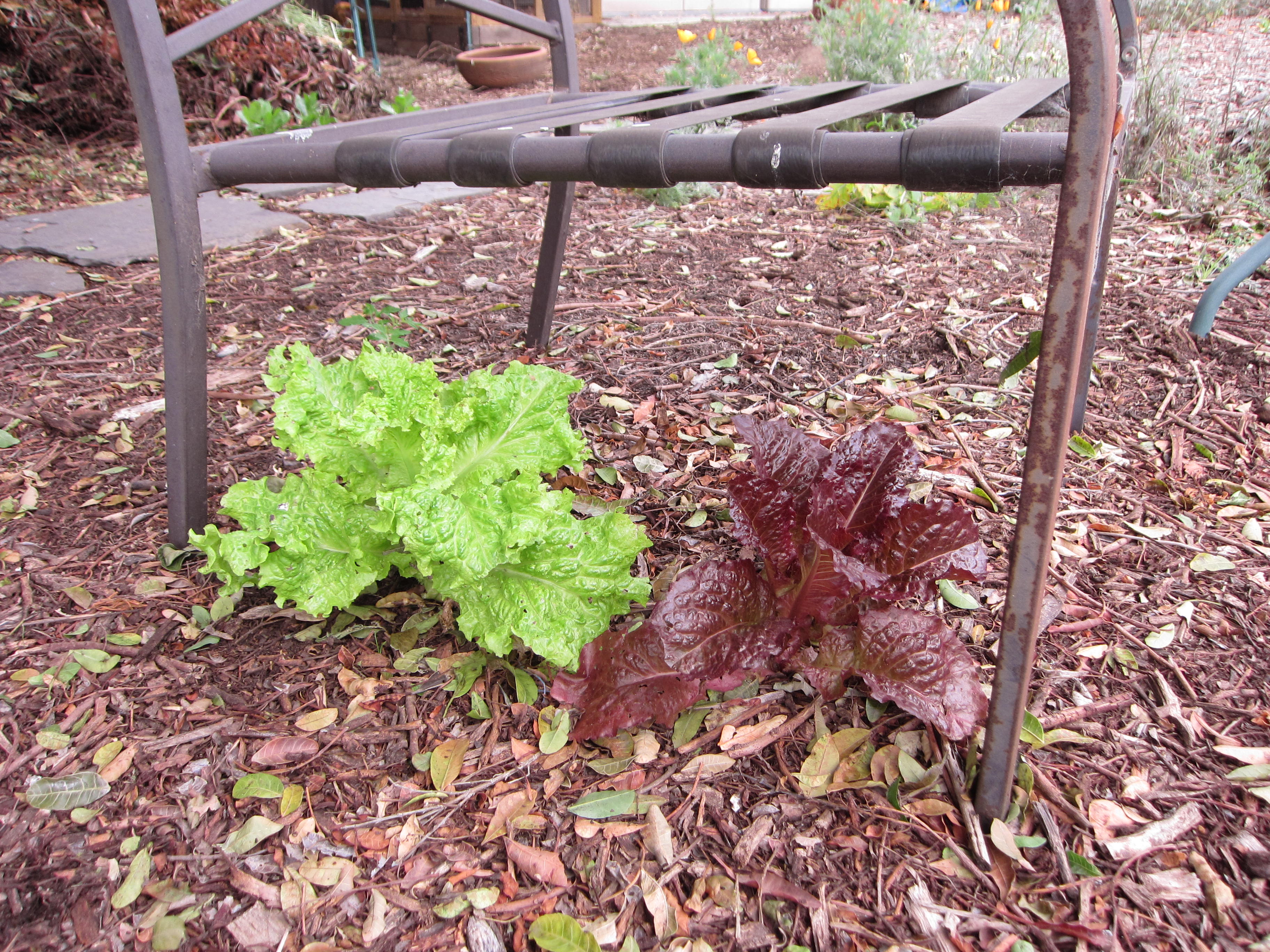 Lettuce volunteers under a lawn chair. We’re feeding a few leaves to the chickens each day from here.