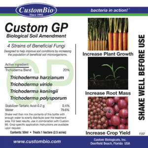 Custom GP – A Biological soil amendment and biofertilizer, by Custom Biologicals, containing 4 specific species of beneficial Trichoderma fungi. Custom GP is a soil probiotic, scientifically designed to help plants grow stronger, healthier roots and improve the overall condition of the soil. Custom GP can be used in organic farming and gardening. Custom GP is a liquid concentrate that helps reduce shipping costs and wasteful packaging. Custom GP is available in two convenient sizes: