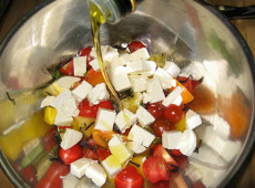 It’s hot as Hades and fires are burning everywhere. The last thing on my mind is to fire up the oven to make dinner. I’ve had a torn-out recipe from the summer 2008 issue of Edible Los Angeles magazine for…well…a year. I’ve been wanting to make it since the first tomatoes of summer fell from the vine, but the timing wasn’t right. Until today. I couldn’t take it anymore.